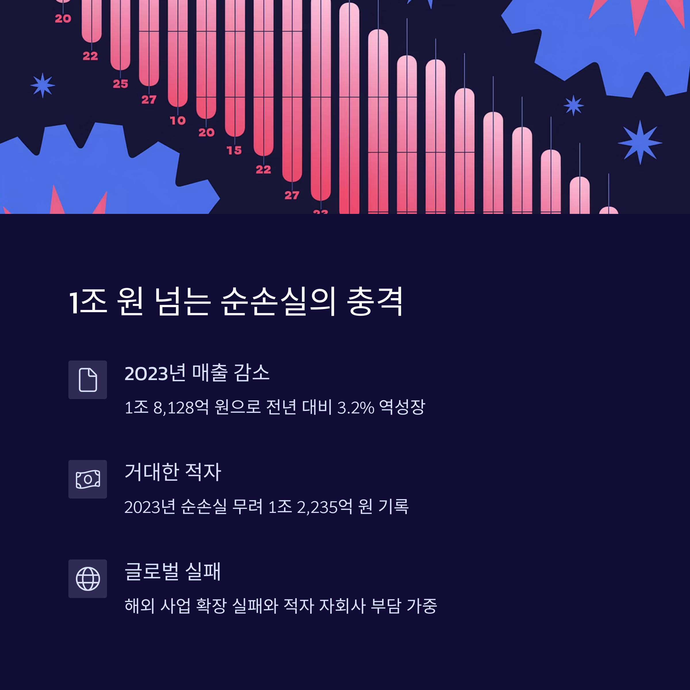 - 순손실 규모는 2022년 6,298억 원 → 2023년 1조 2,235억 원 → 2024년 2,591억 원으로 3년 연속 수천억 원대 적자를 기록 중입니다.