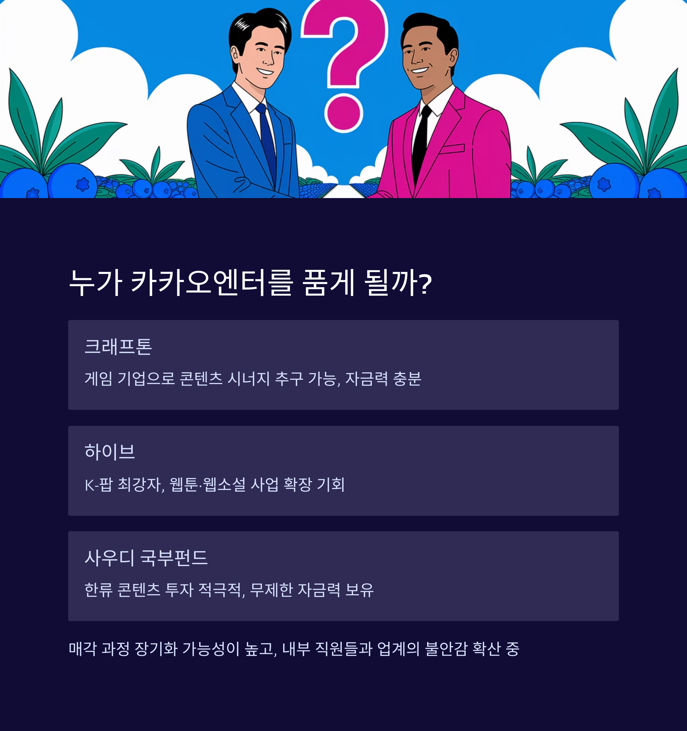 - 실제로 카카오는 주요 주주사에 경영권 매각 의사를 전달한 것으로 확인되었습니다.