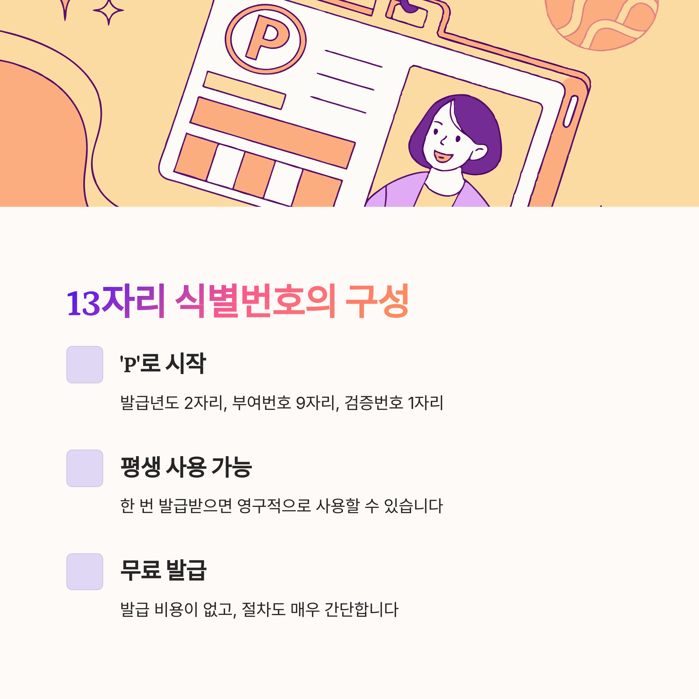 'P'로 시작해 발급년도 2자리, 부여번호 9자리, 검증번호 1자리로 구성되어 있으며