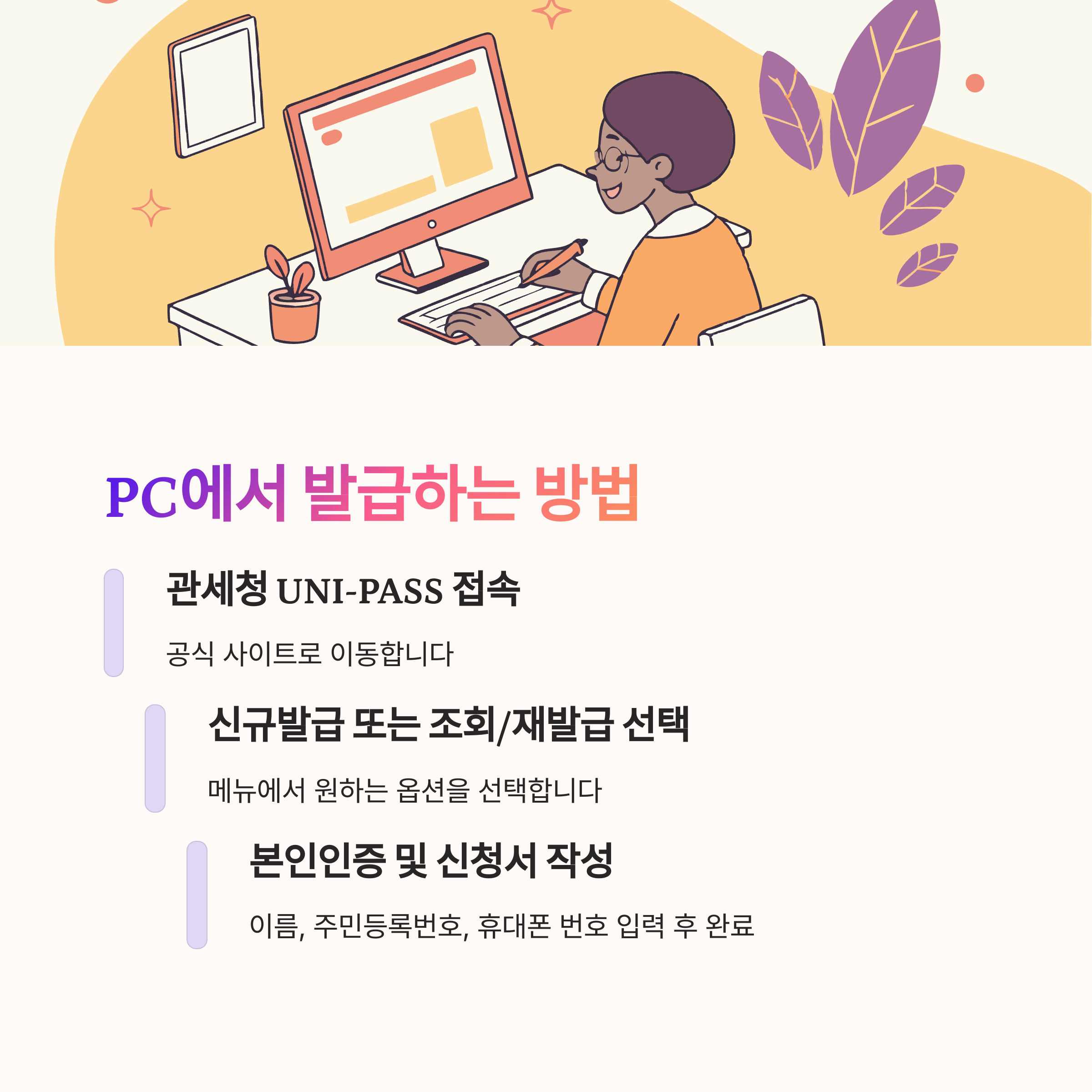 | PC | UNI-PASS 접속 → 본인인증 → 신청서 작성 | 공동인증서/휴대폰 | 약 5~10분 |