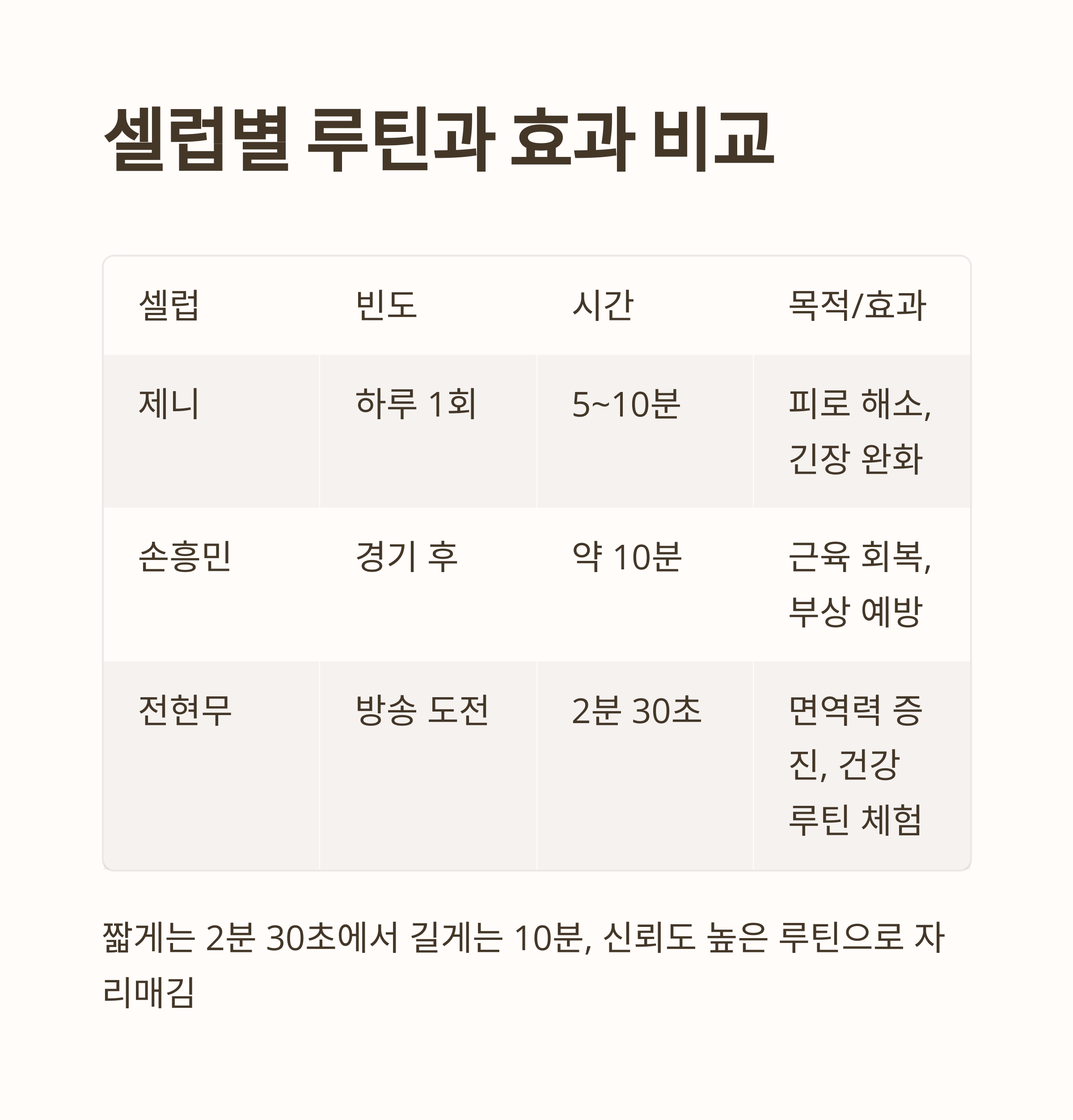 | 셀럽 | 실천 빈도 | 시간(1회) | 목적/효과 |