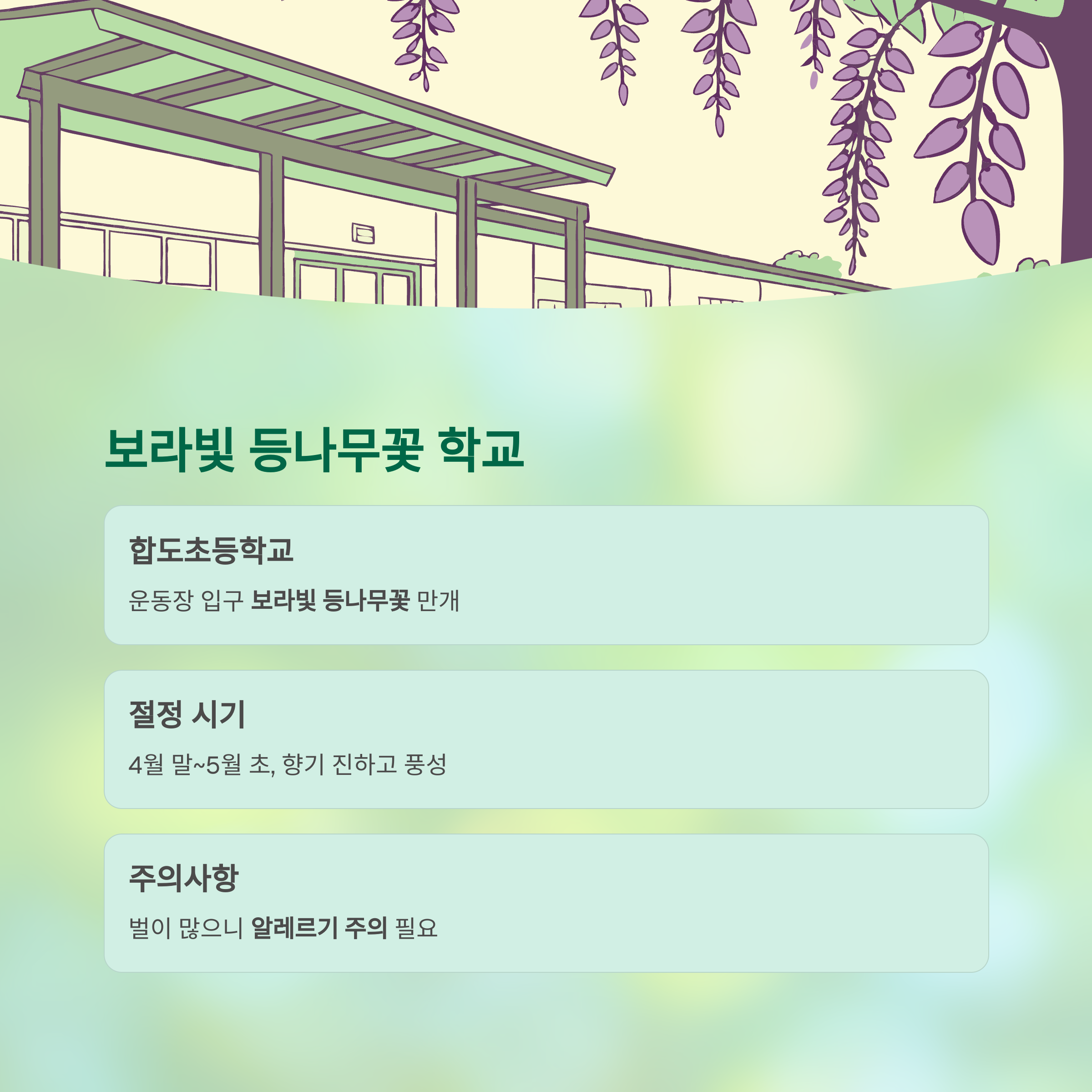 | 합도초등학교 | 등나무꽃 아치 + 학교 정문 | 4월 말~5월 초 |