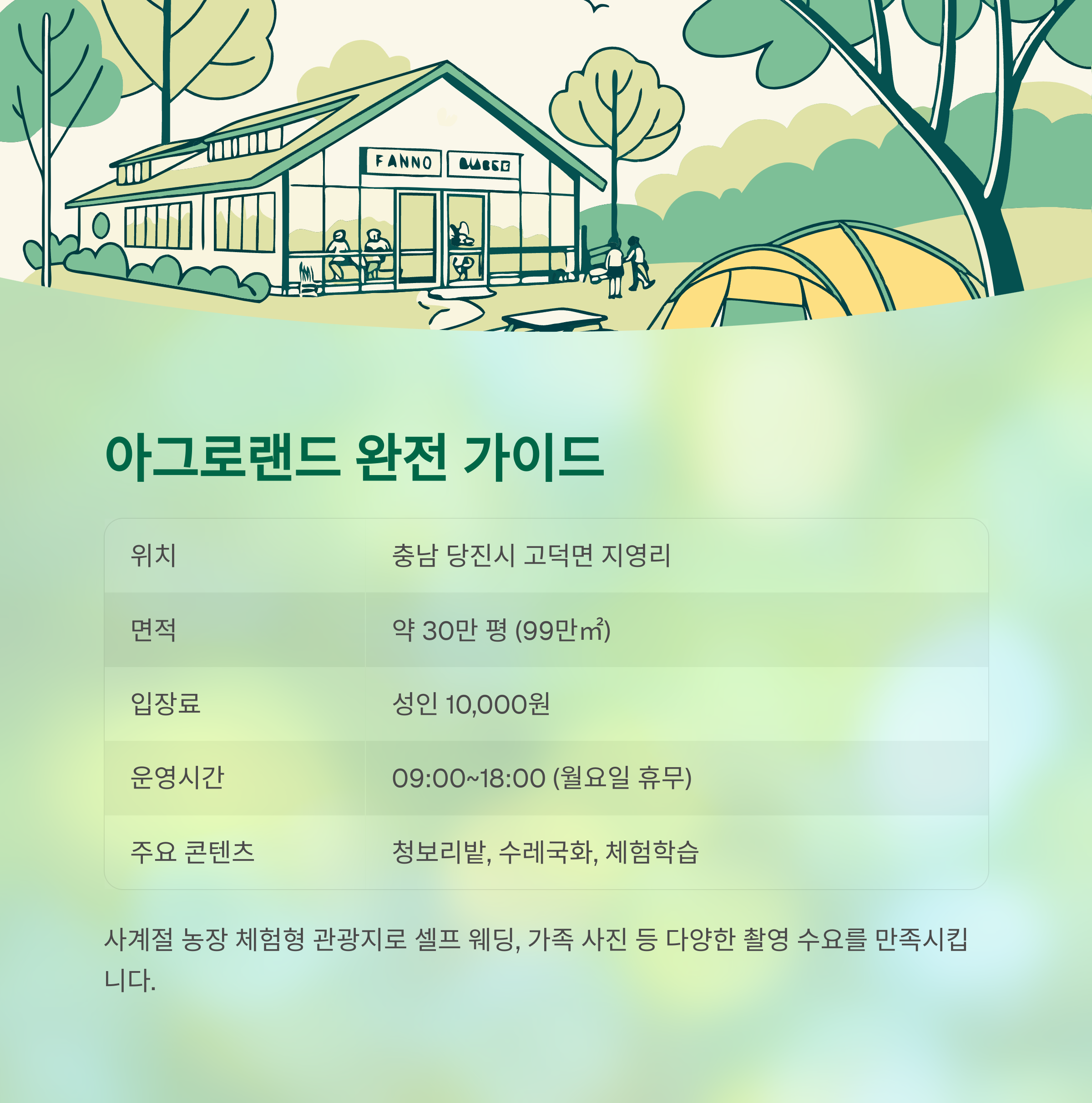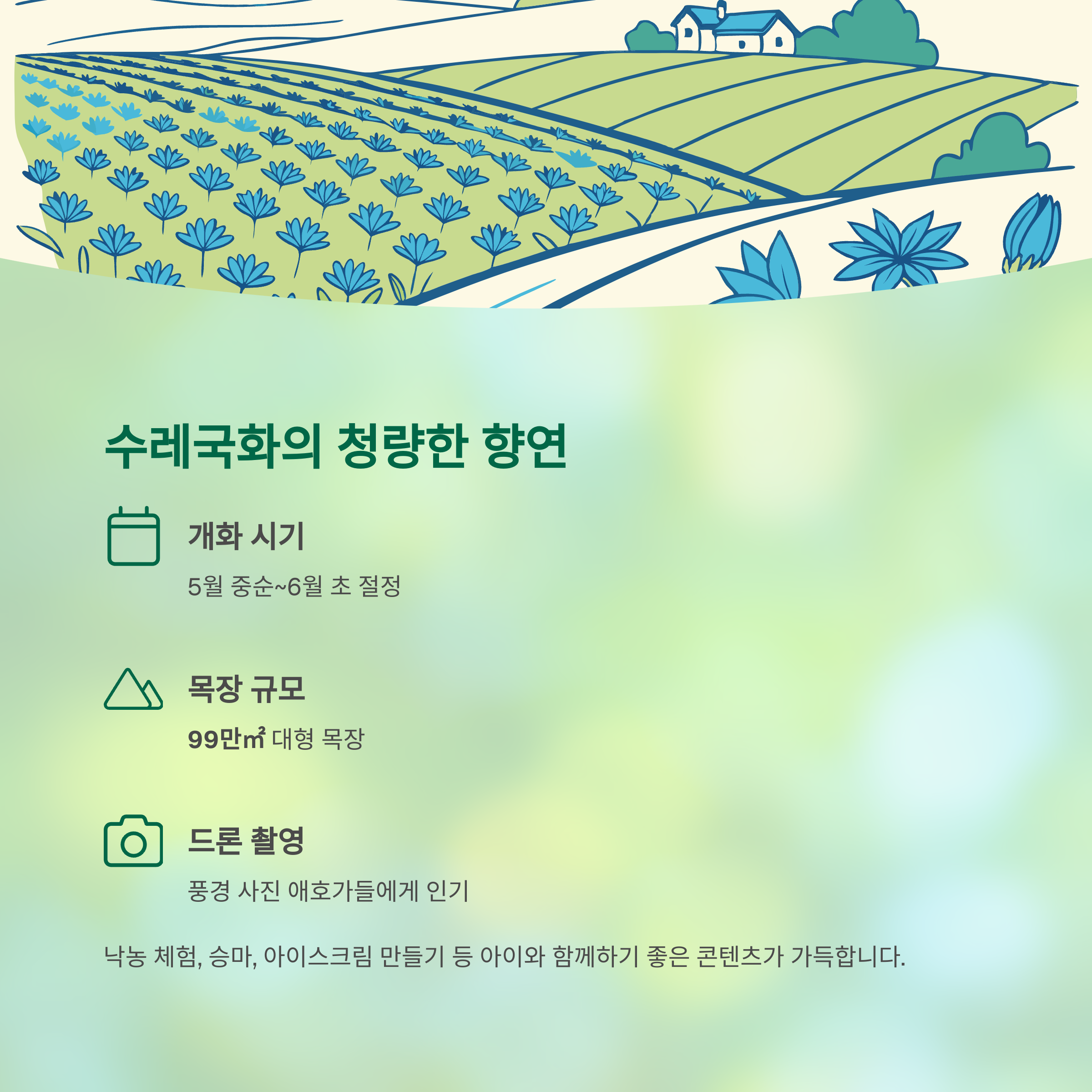 | 주요 콘텐츠 | 청보리밭, 수레국화, 메타세콰이어길, 체험학습 등 |