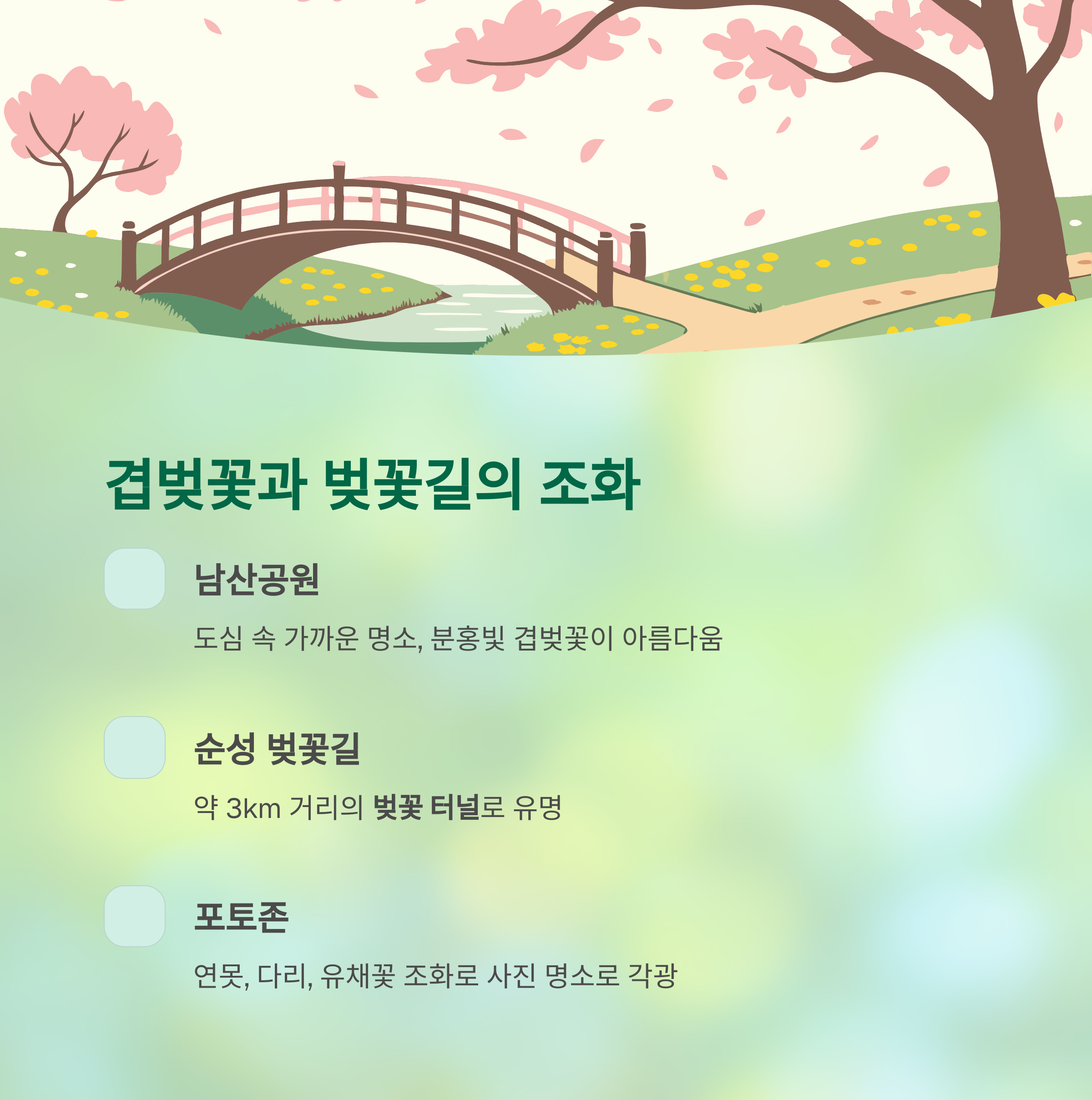 | 남산공원 | 겹벚꽃 산책로 + 돌다리 | 4월 초~중순 |
