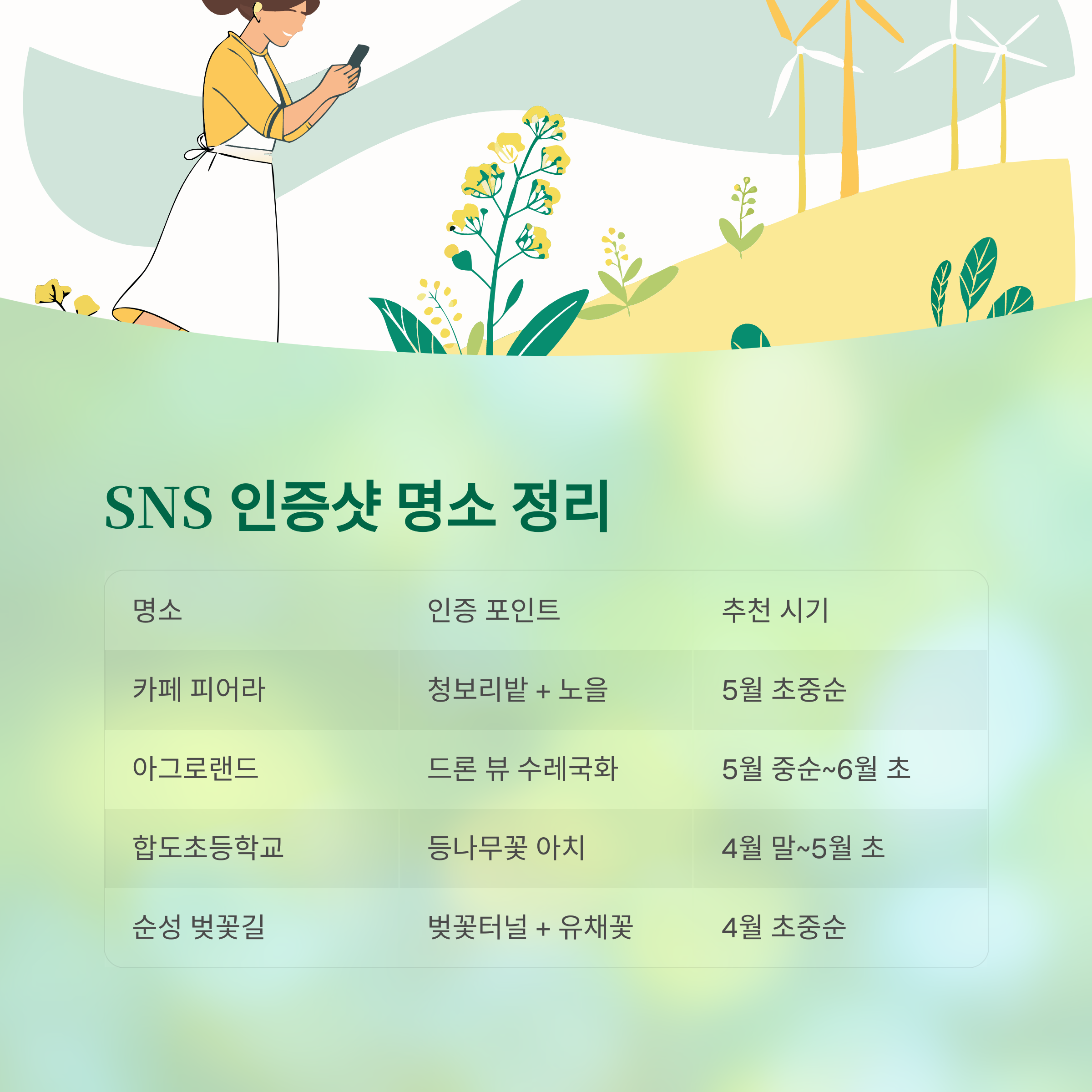 | 순성 벚꽃길 | 벚꽃터널 + 유채꽃 조화 | 4월 초~중순 |