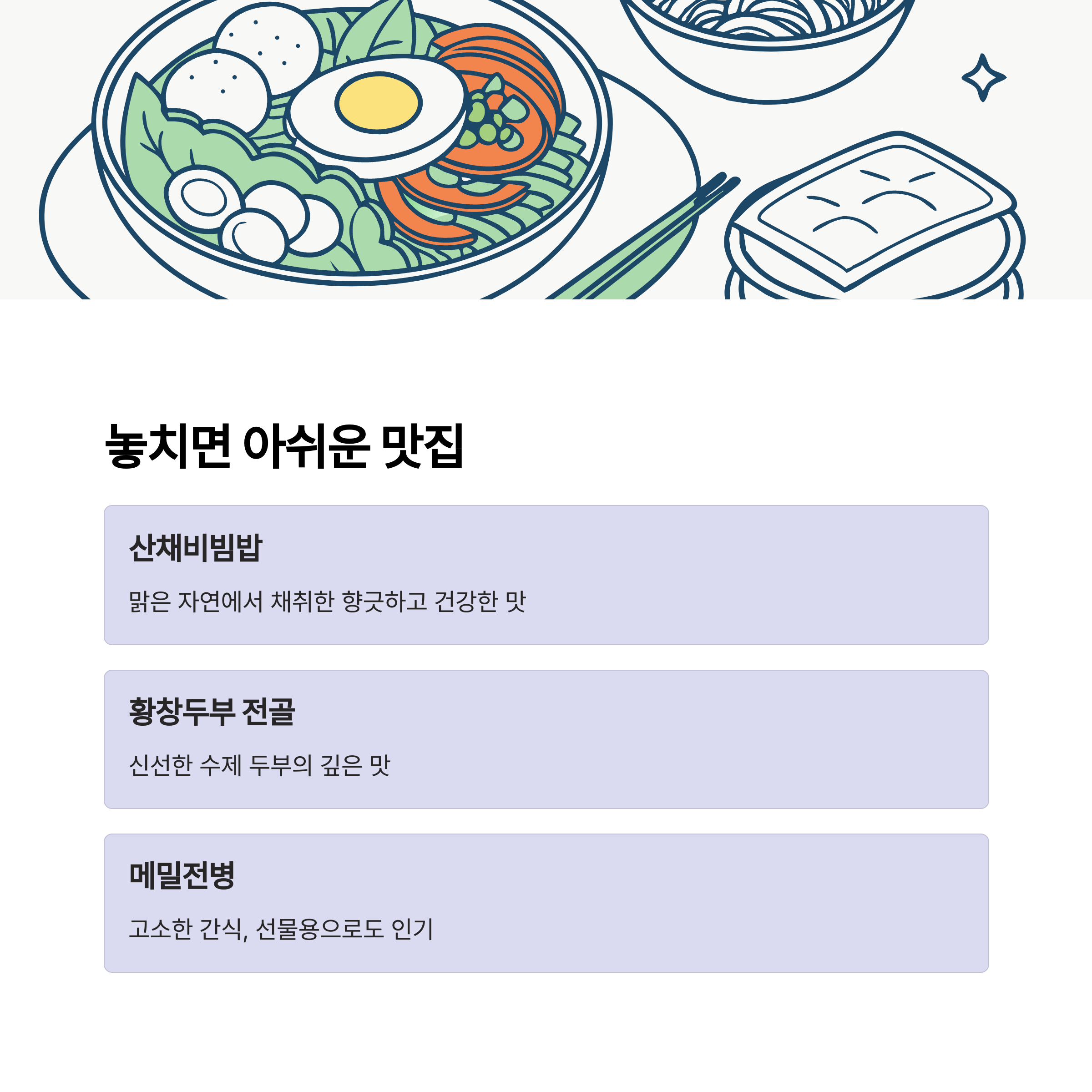 | 먹거리 | 산채비빔밥, 두부전골, 송어회·구이 | 건강한 식재료 중심, 현지 인기 맛집 존재 |