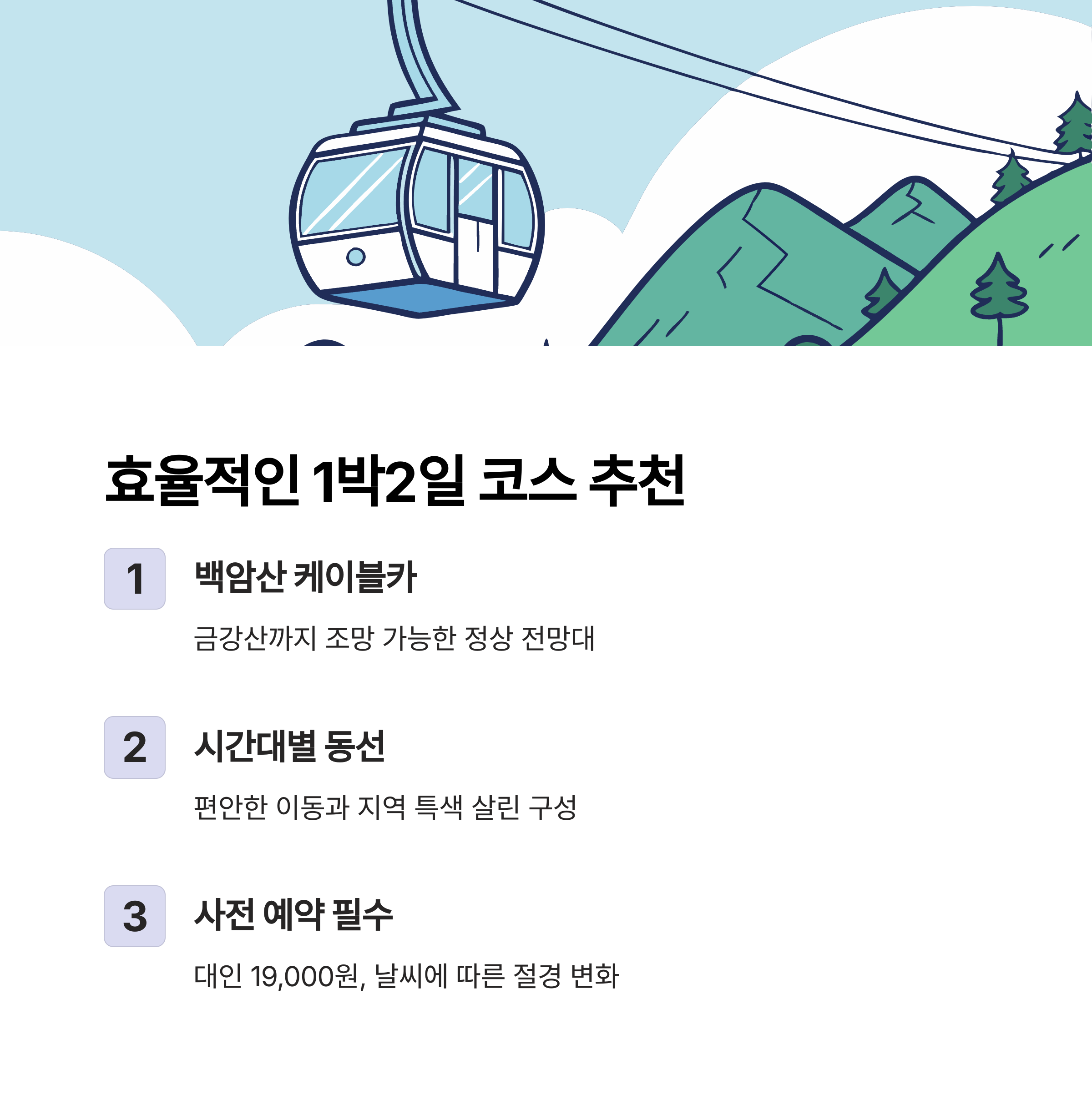 | DAY 1 오전 | 백암산 케이블카 탑승, 정상 전망대 감상 |