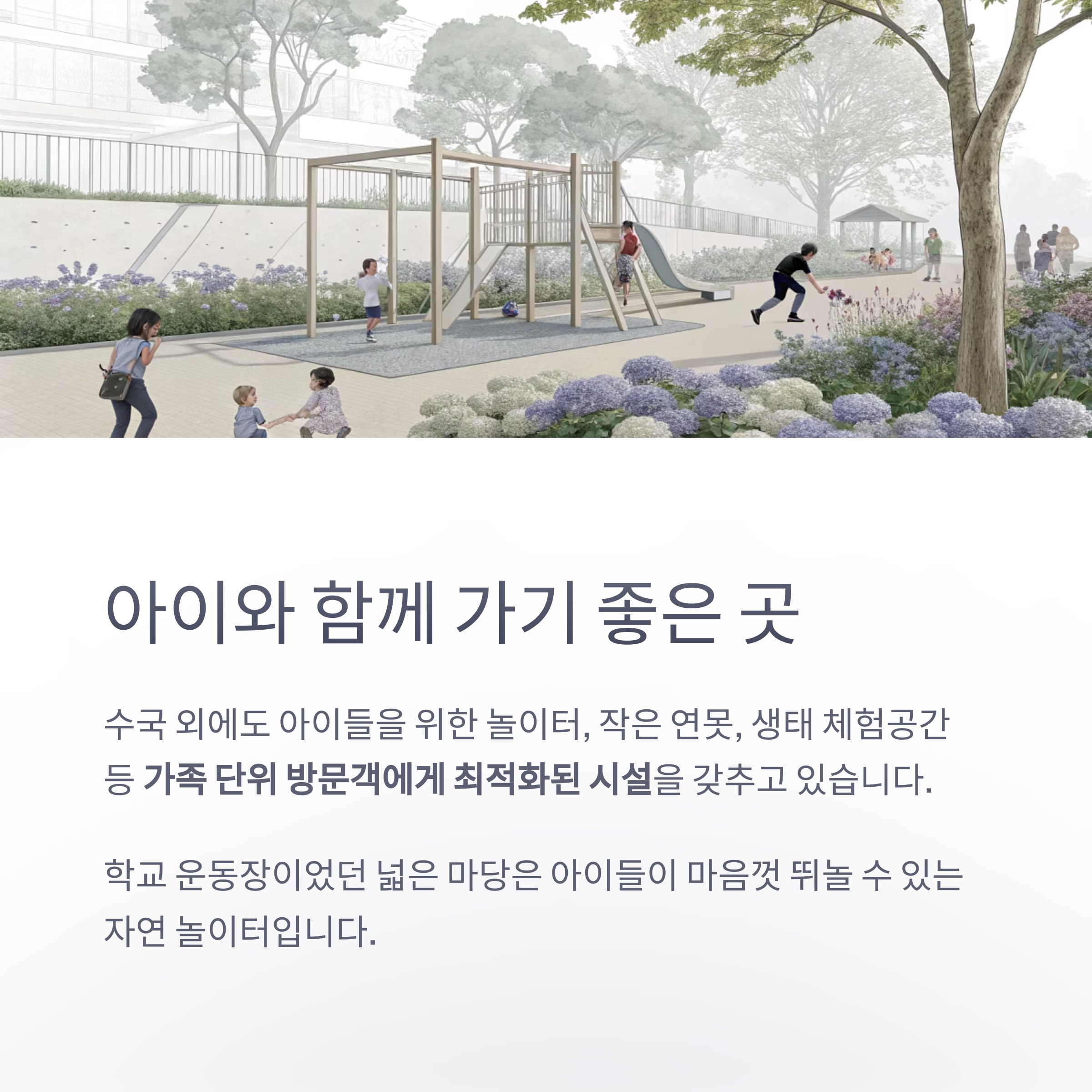생태 체험공간 등 가족 단위 방문객에게 최적화된 시설을 갖추고 있습니다.