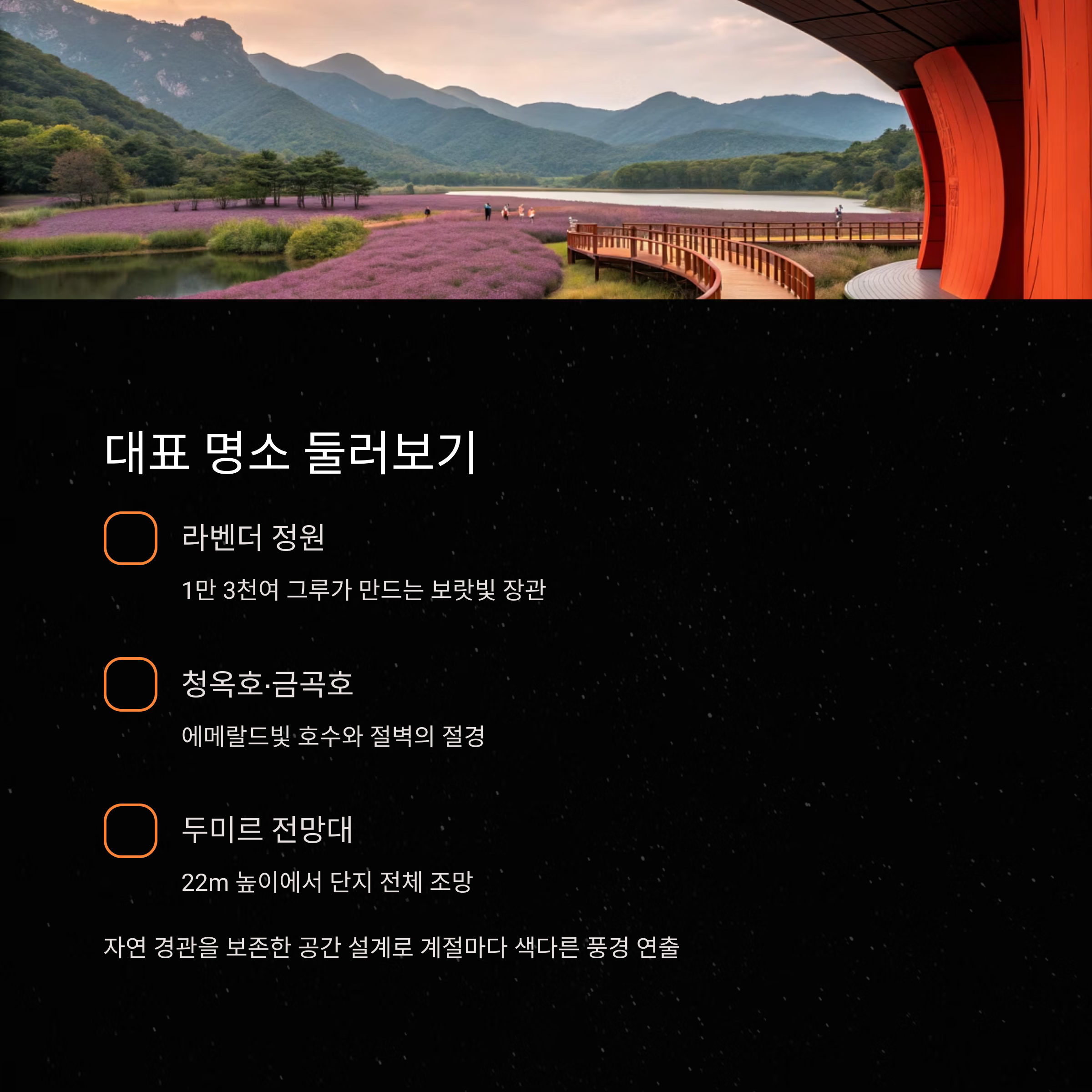 | 라벤더 정원 | 1만 3천여 그루 식재, 여름철 장관 |