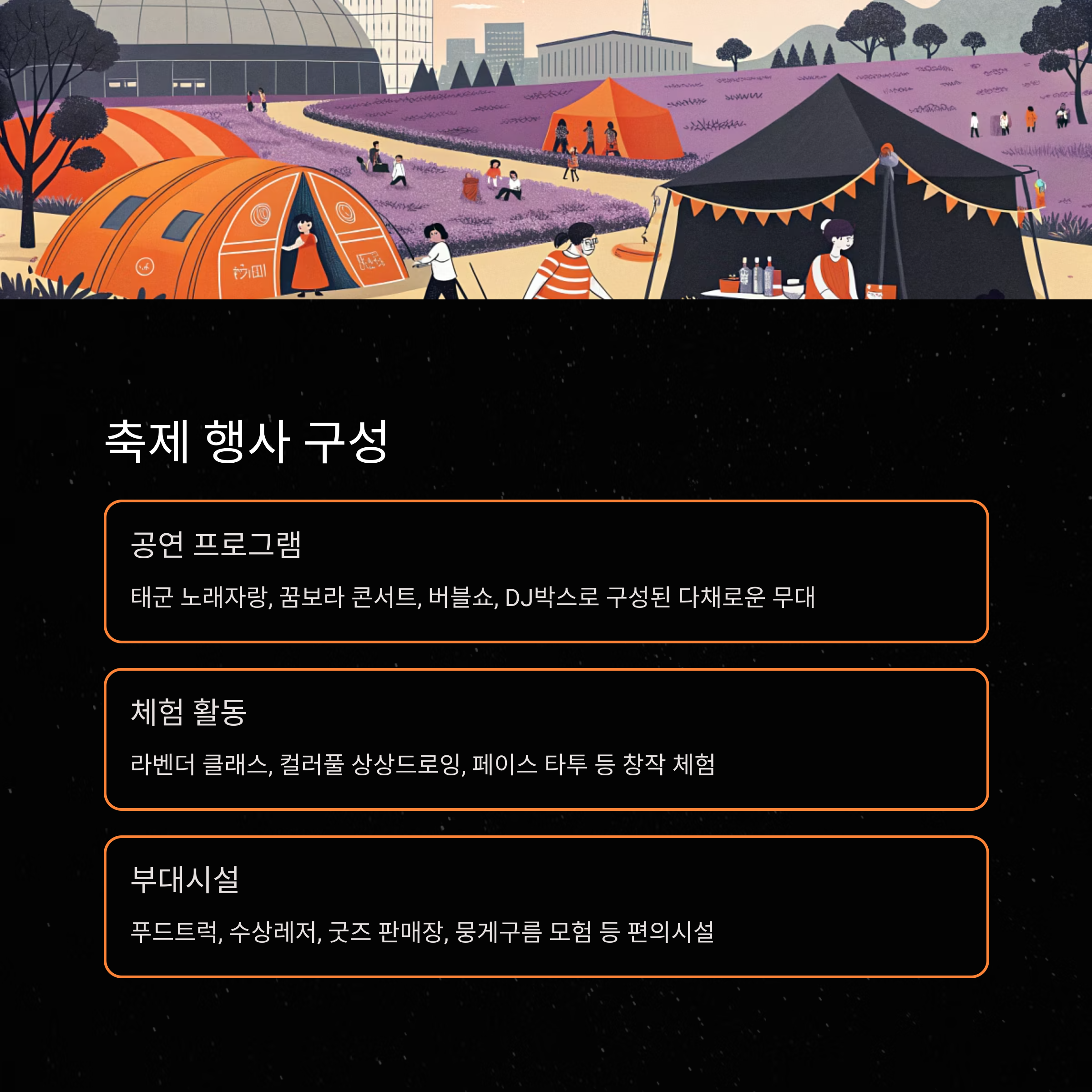 | 체험 | 라벤더 클래스, 컬러풀 상상드로잉, 페이스 타투 등 |