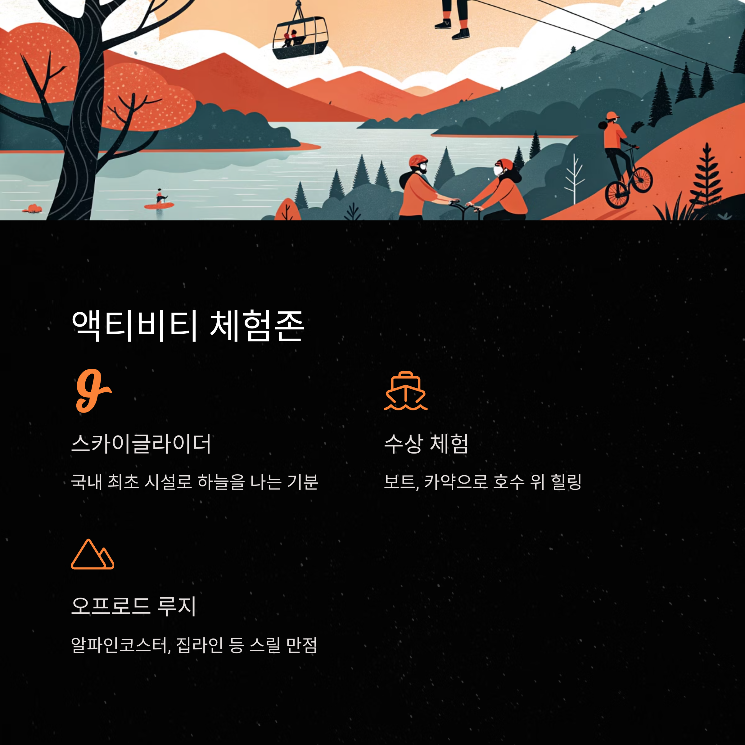 | 액티비티 | 글라이더, 오프로드 루지, 알파인코스터, 집라인 등 국내 최초 시설 운영 |