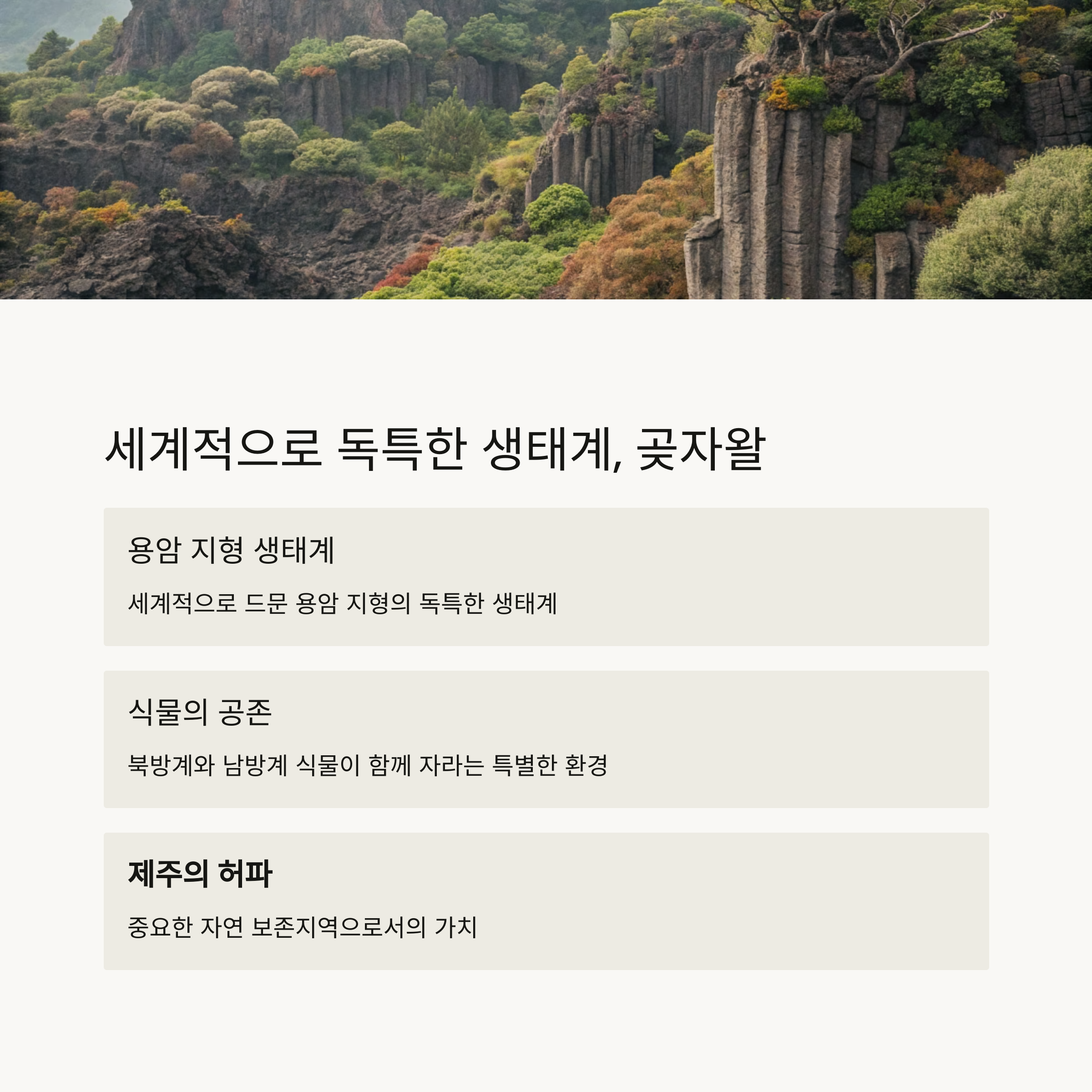 "제주의 허파"로 불릴 정도로 중요한 자연 보존지역이며, 트레킹을 통해 그 생명력을 직접 경험할 수 있습니다.
