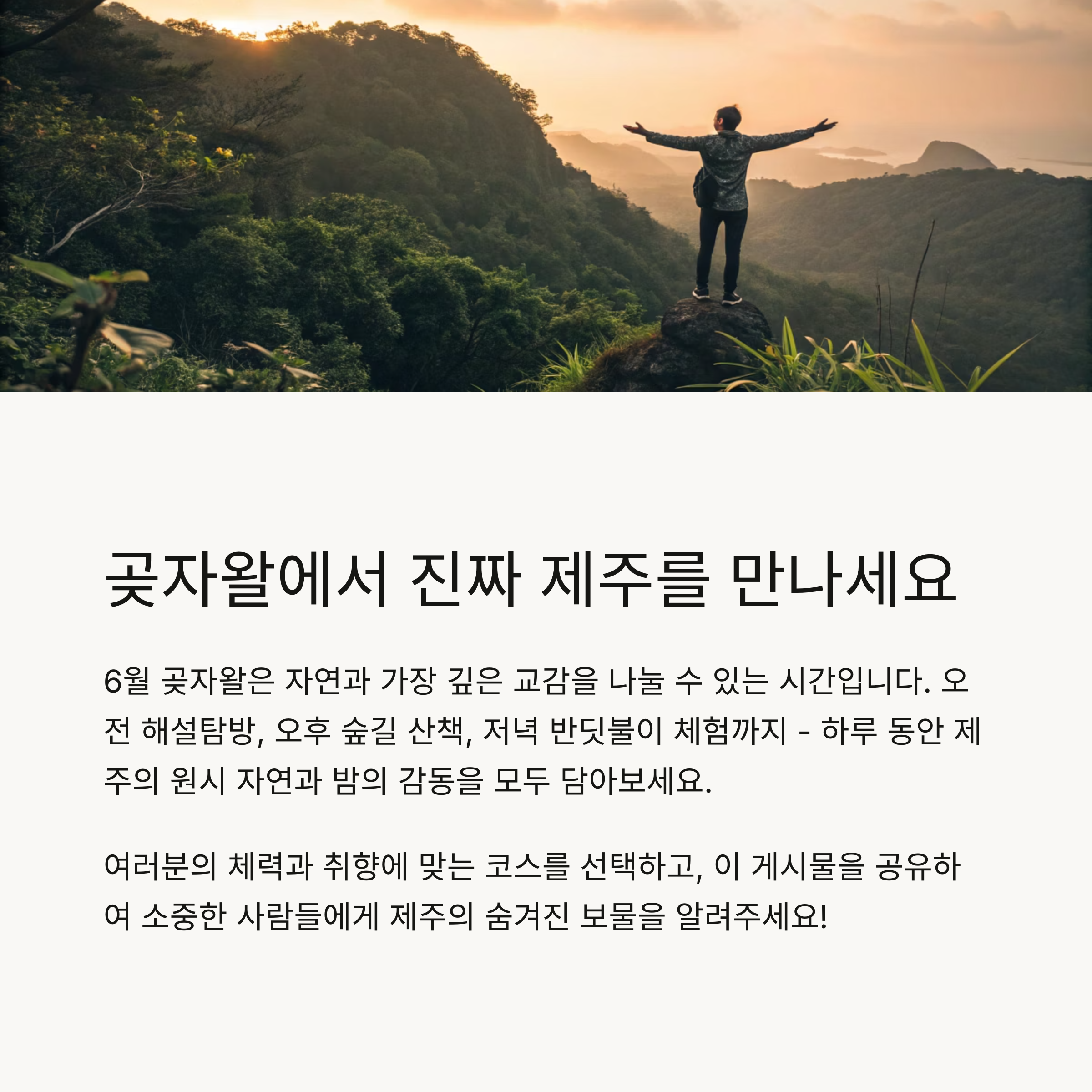 저녁 청수 반딧불이 체험까지 연결하면 하루 동안 제주의 원시 자연과 밤의 감동을 모두 담을 수 있습니다.