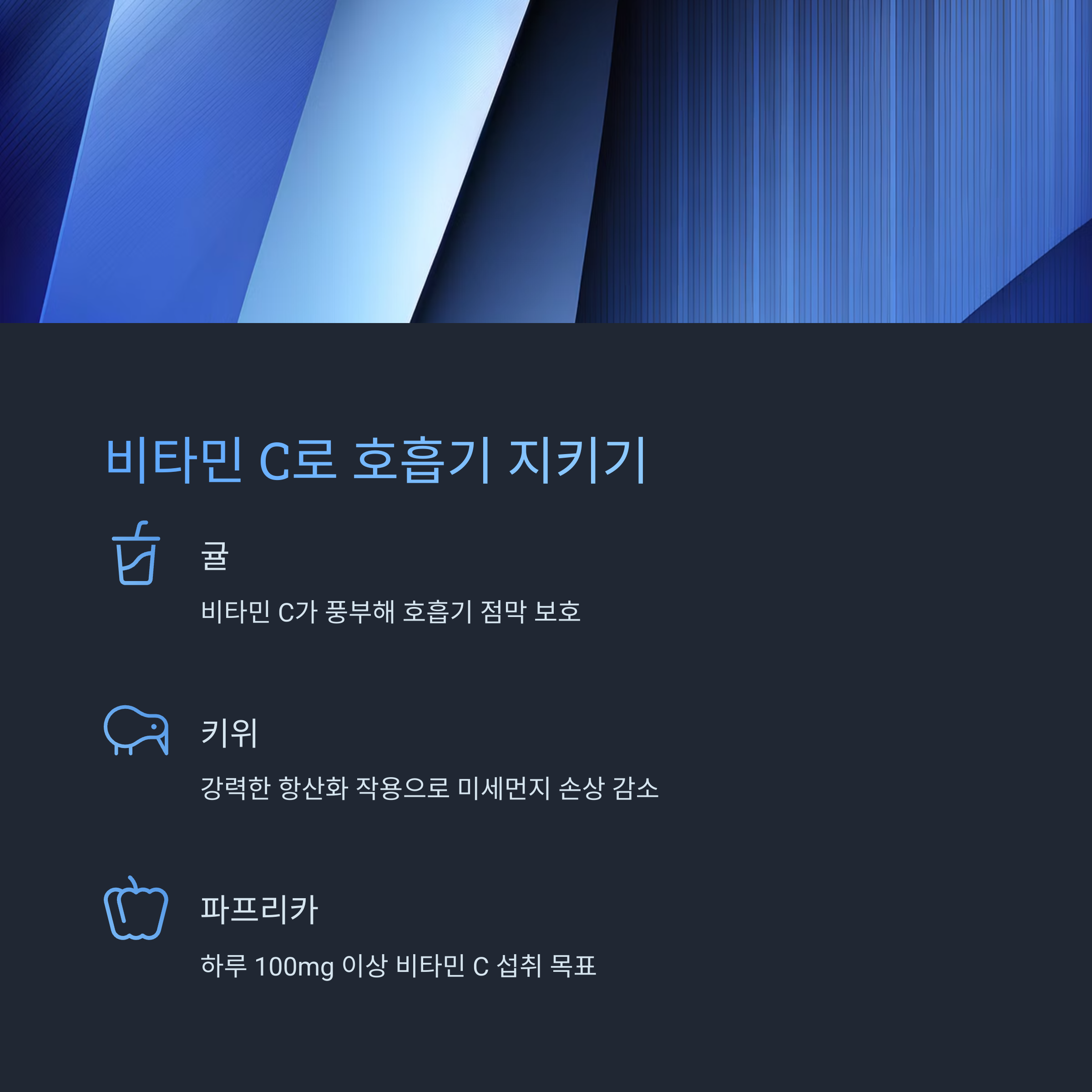 귤, 키위, 파프리카에는 비타민 C가 풍부해 강력한 항산화 작용으로 호흡기 점막을 보호하고 미세먼지로 인한 손상을 줄여줍니다. 비타민 C는 감기 예방과 면역력 강화에도 좋으며, 하루 100mg 이상 섭취를 목표로 하세요.