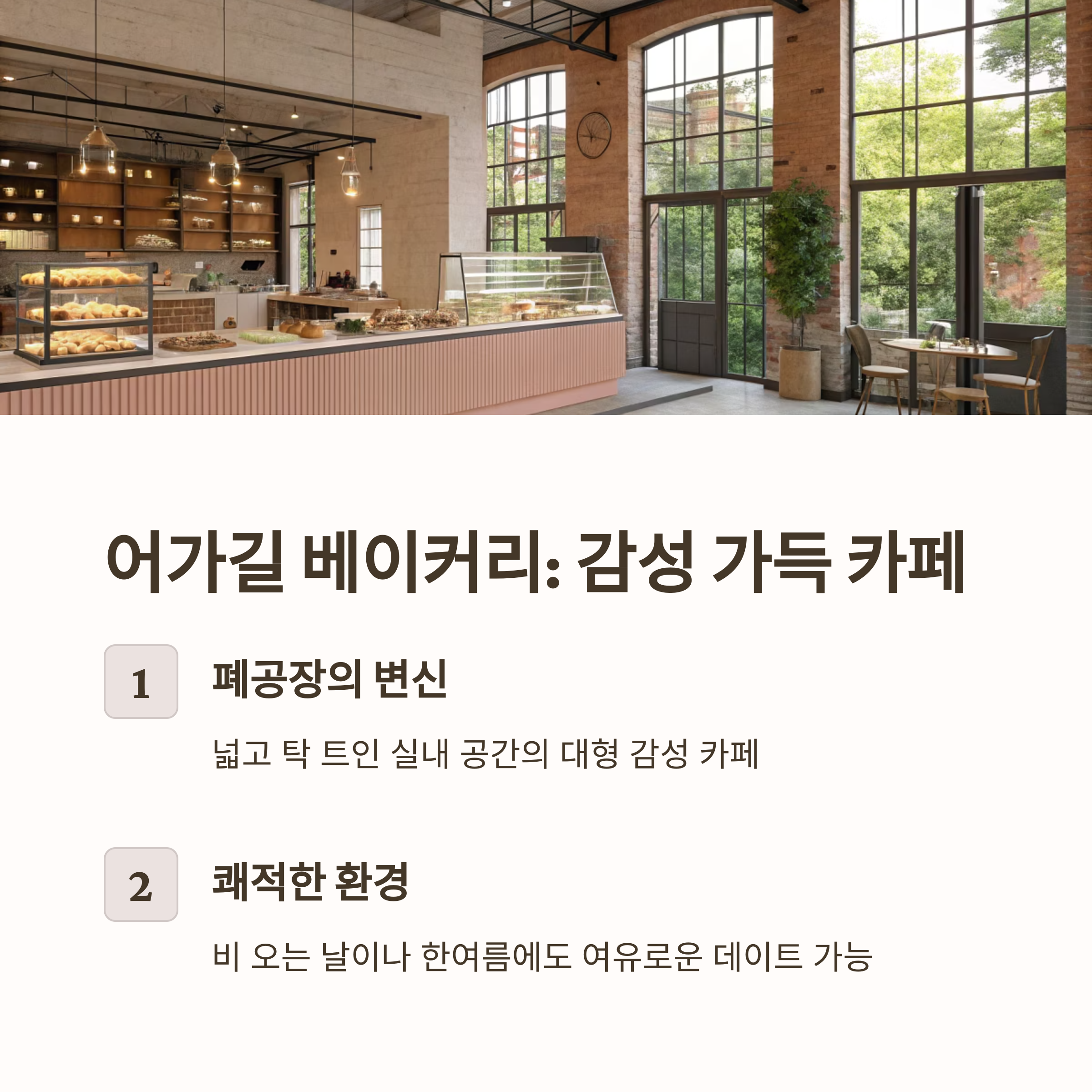 | 어가길 베이커리 | 대형 감성 카페, 다양한 빵 | 음료·빵 별도 구매 | 감성 데이트, 포토존 |