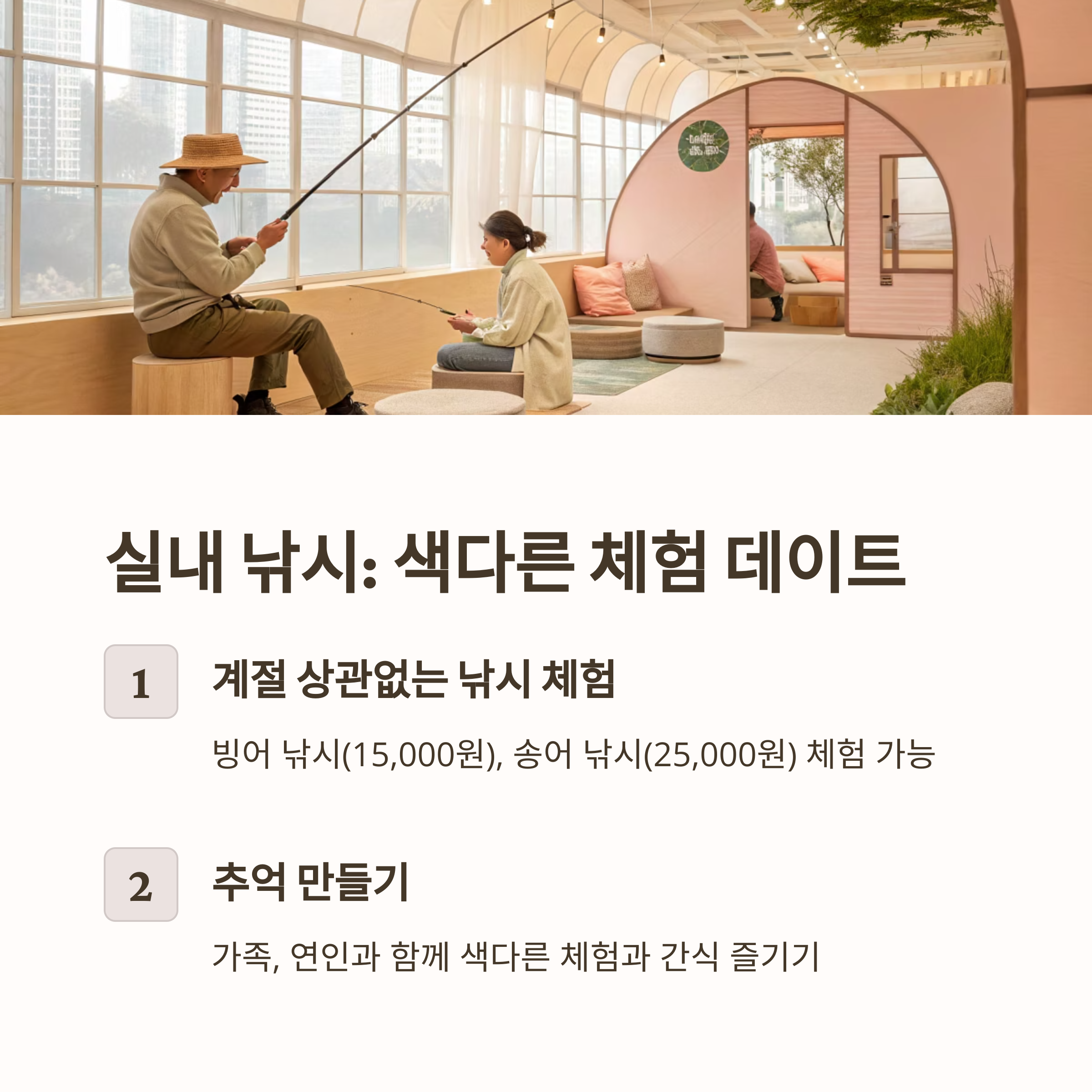 | 실내 낚시체험 | 빙어·송어 실내 낚시 | 15,000~25,000원 | 실내 체험, 가족·연인 추천 |
