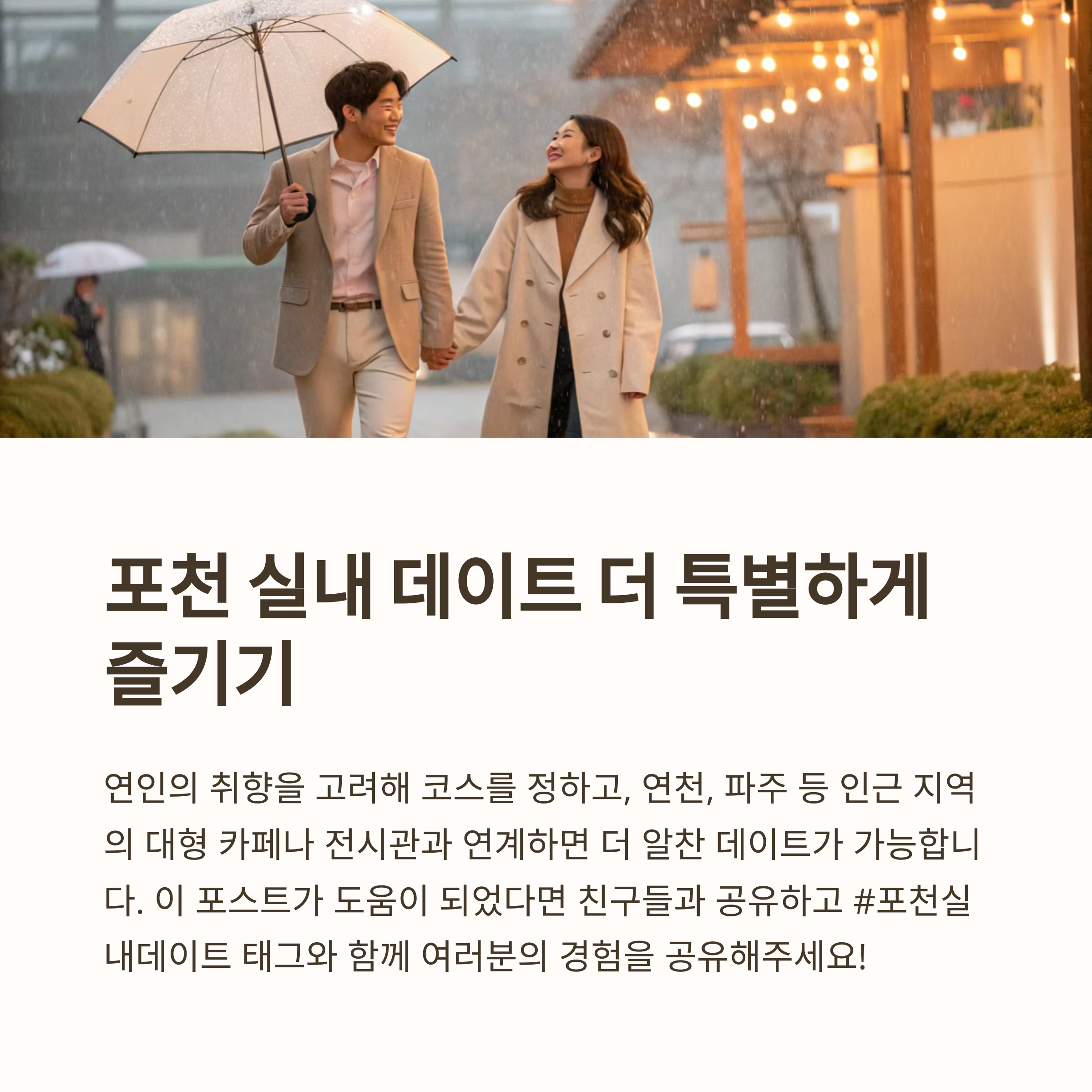 포천은 자연과 문화가 조화를 이루는 곳으로, 실내에서도 충분히 알찬 데이트와 볼거리를 즐길 수 있는 명소가 많습니다. 이번 글에서는 2025년 최신 정보와 여행자들의 생생한 후기를 바탕으로 포천에서 추천하는 실내 데이트 명소와 놀거리를 정리해 보았습니다. 비 오는 날, 무더운 여름날, 혹은 겨울철에도 쾌적하게 즐길 수 있는 데이트 코스를 소개해 드리니 참고해 보시기 바랍니다.