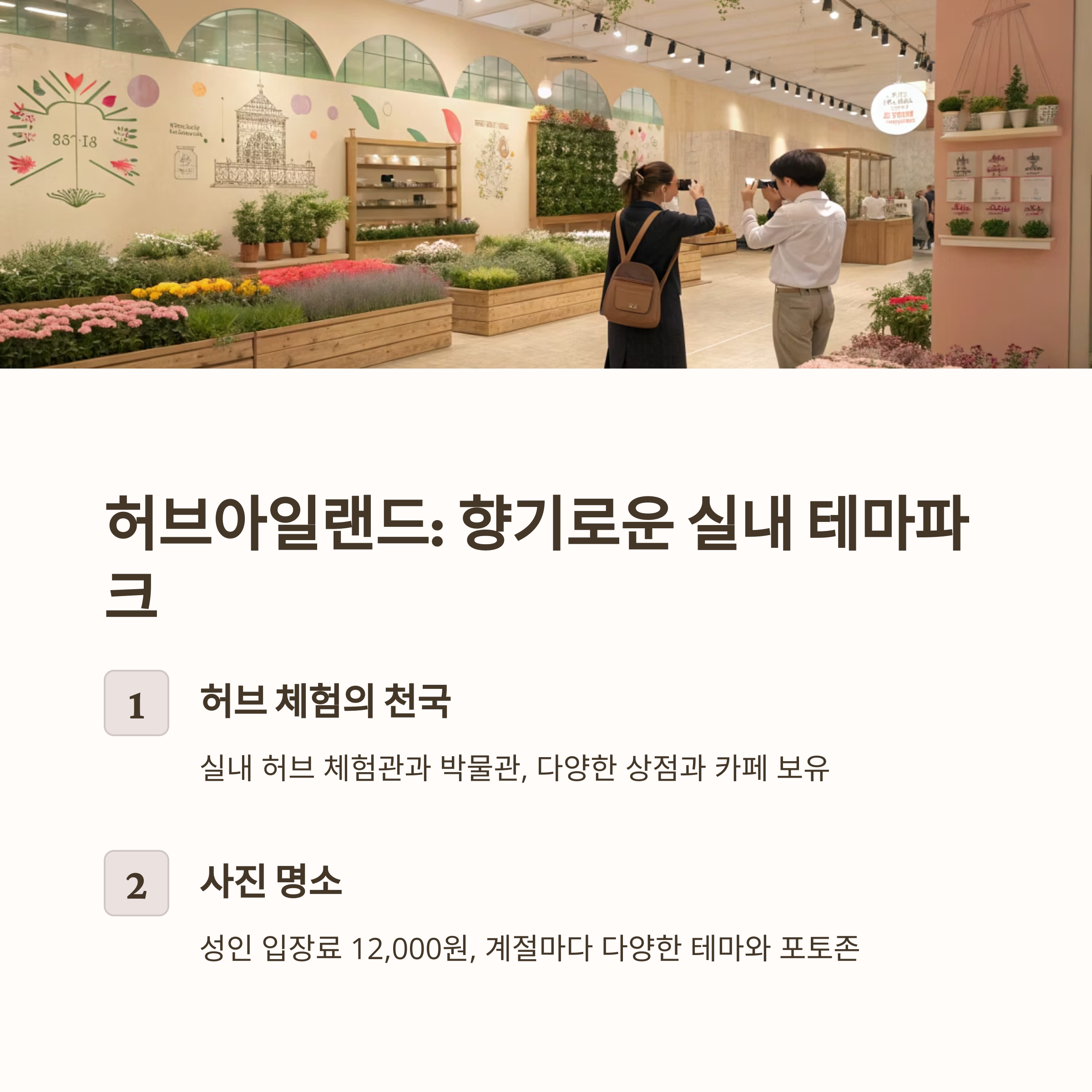 | 허브아일랜드 | 실내 허브 체험, 테마파크 | 12,000원 | 체험, 쇼핑, 포토존 |