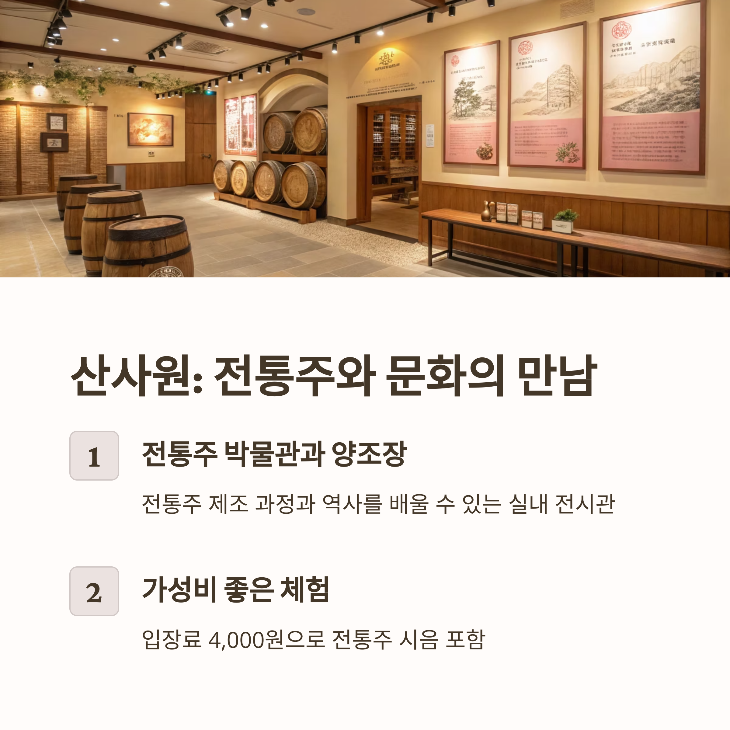 | 산사원 | 전통주 박물관, 시음 체험 | 4,000원 | 전통주 시음, 문화체험 |