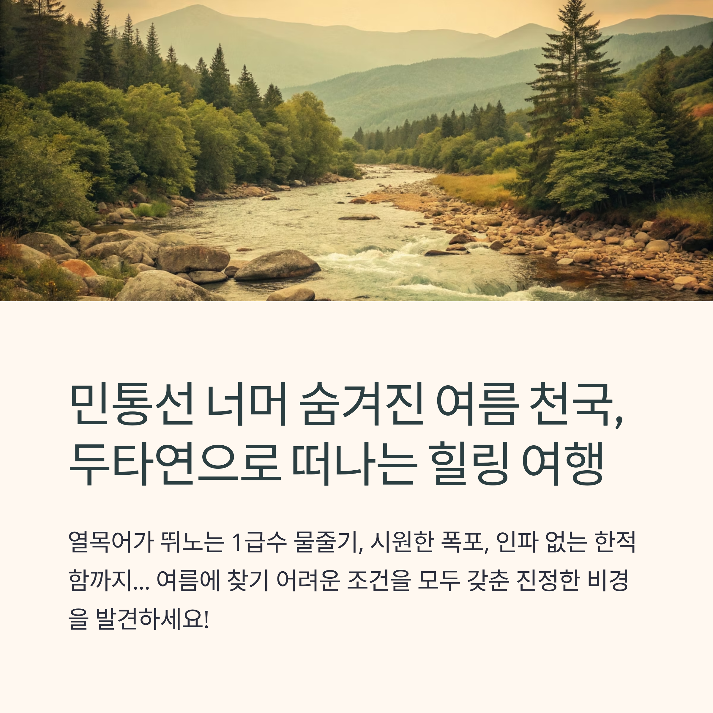 두타연은 강원도 양구의 민간인출입통제선 안쪽, 자연이 고스란히 살아 숨 쉬는 계곡입니다. 열목어가 뛰노는 1급수 물줄기, 시원한 폭포, 인파 없는 한적함까지… 여름에 찾기 어려운 조건을 모두 갖춘 진정한 비경입니다. 철저한 출입 통제 속 보존된 생태계 덕분에, 생태관찰은 물론 역사적 의미까지 함께 느낄 수 있는 특별한 여행지입니다.
