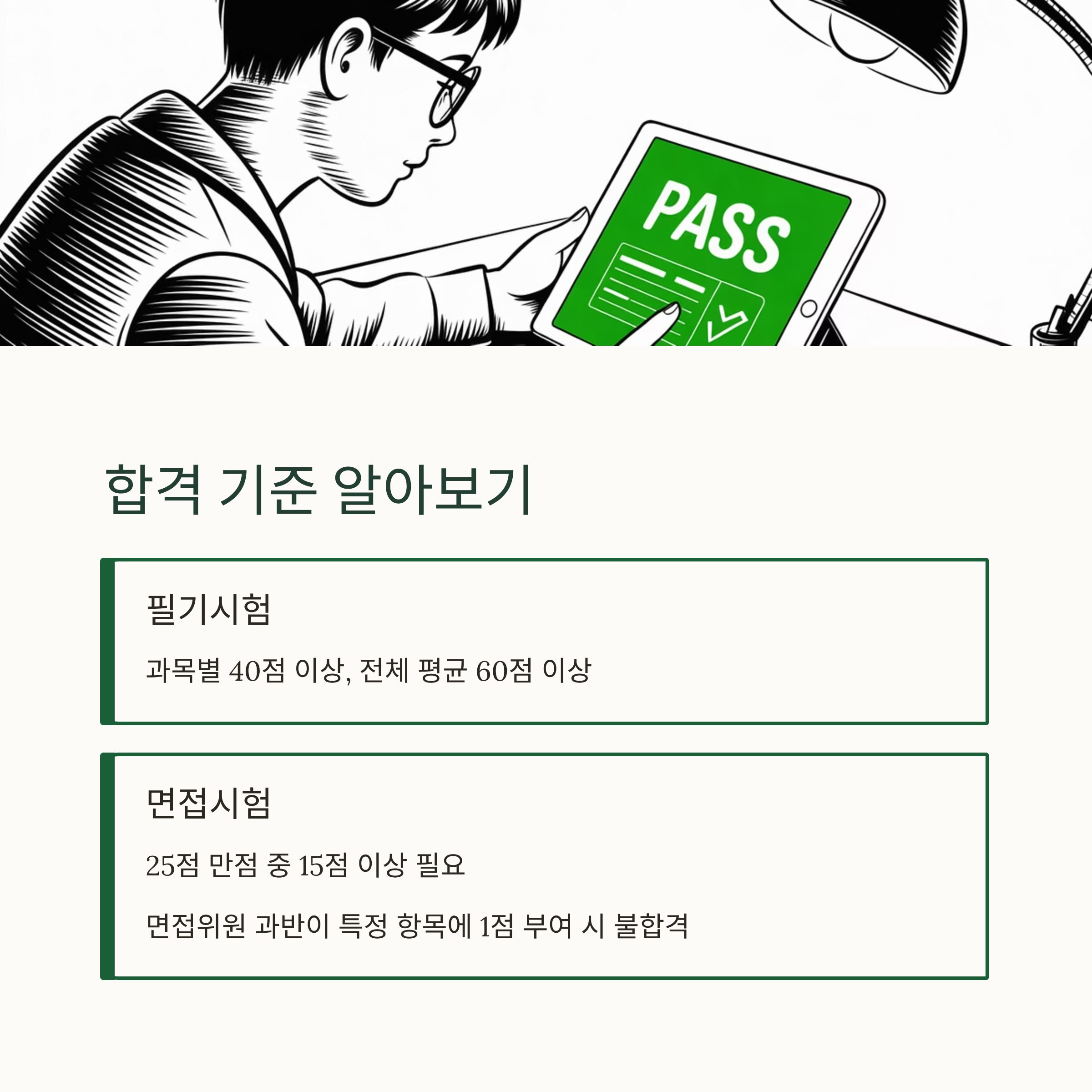 필기시험은 과목별 40점 이상, 전체 평균 60점 이상이어야 합격입니다.