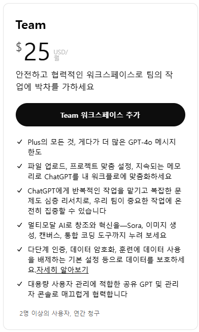 ✔ 팀 요금제: 회사 내 여러 명이 AI를 사용해야 하는 경우