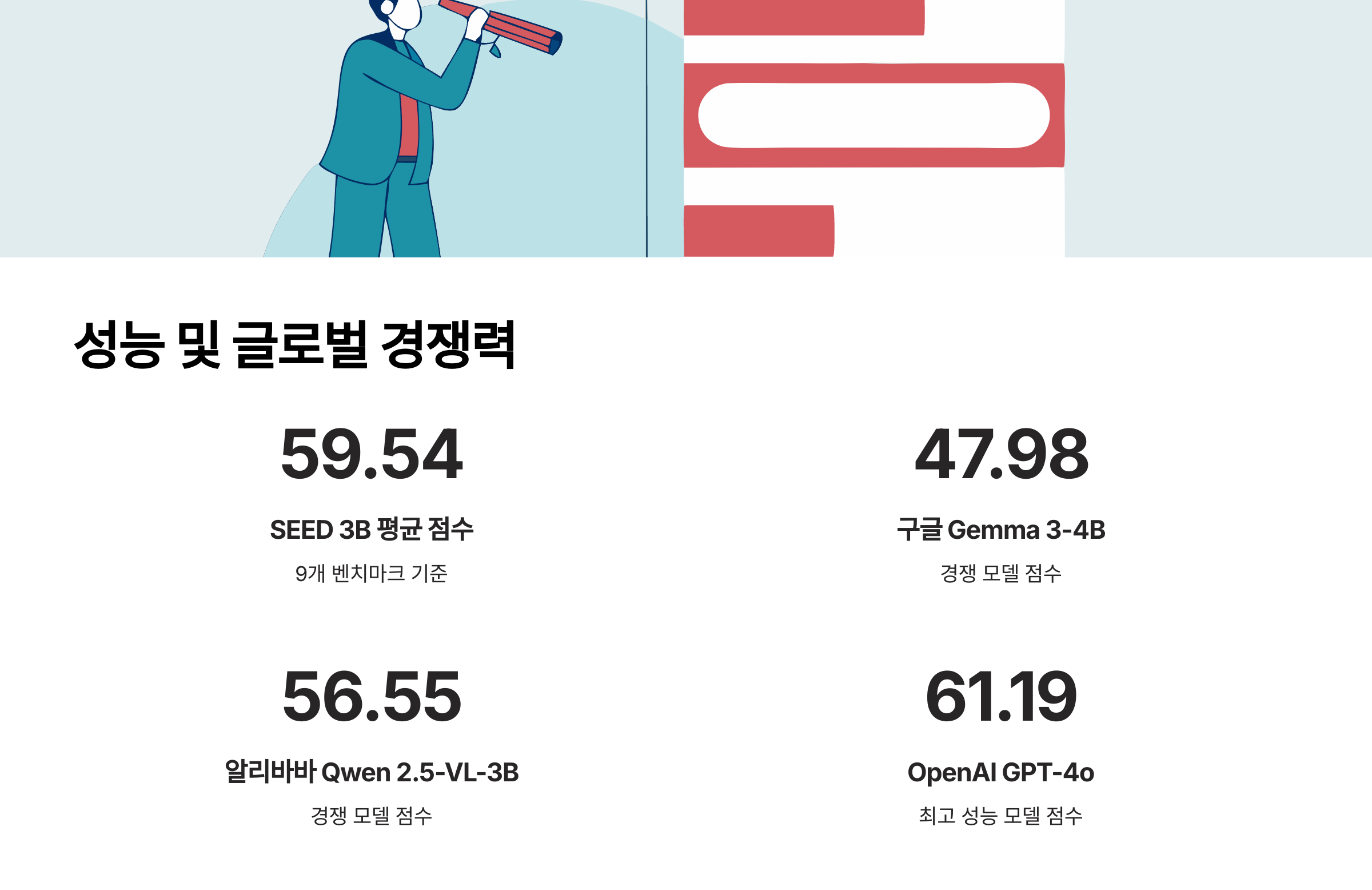 SEED 3B 모델은 특히 멀티모달 AI 성능에서 주목받고 있다. 한국어 및 영어 기반의 시각정보 처리 능력을 평가하는 9개 벤치마크에서 평균 59.54점을 기록하며, 구글의 Gemma 3-4B (47.98점), 알리바바의 Qwen 2.5-VL-3B (56.55점) 보다 높은 성능을 보였다.