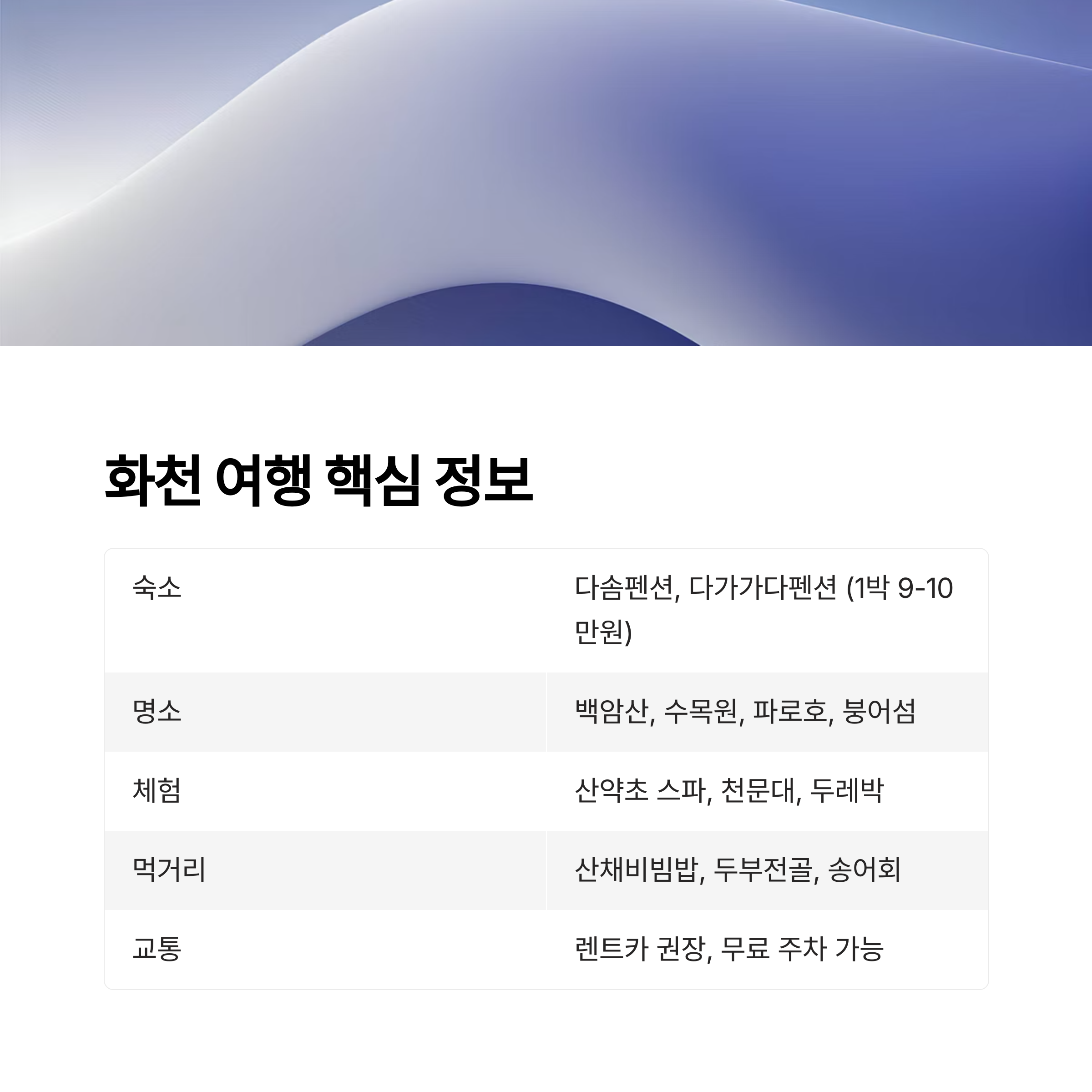 | 명소 | 백암산, 아를테마 수목원, 파로호, 붕어섬 | 무료 주차 가능, 사진 명소 다수 |