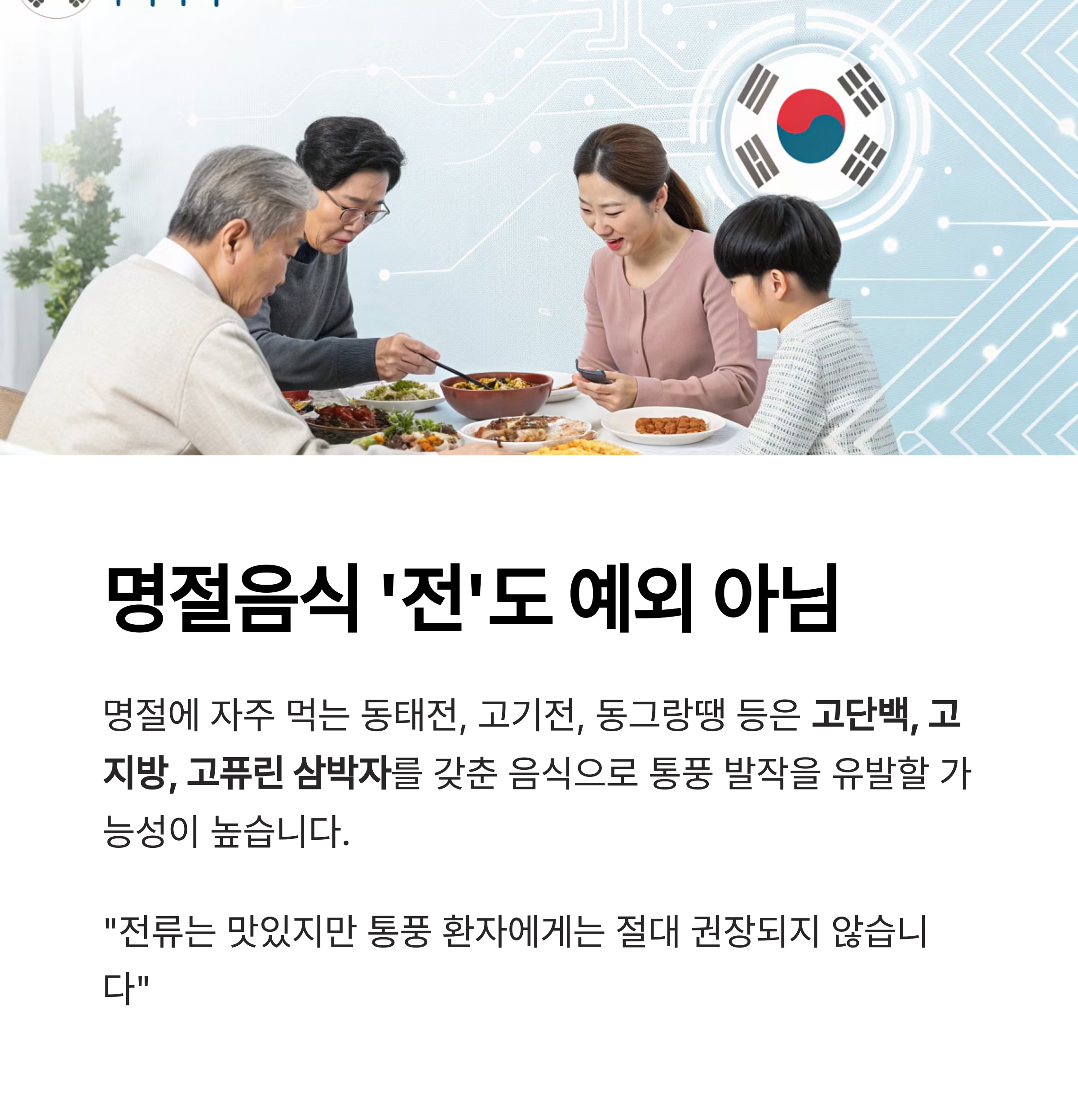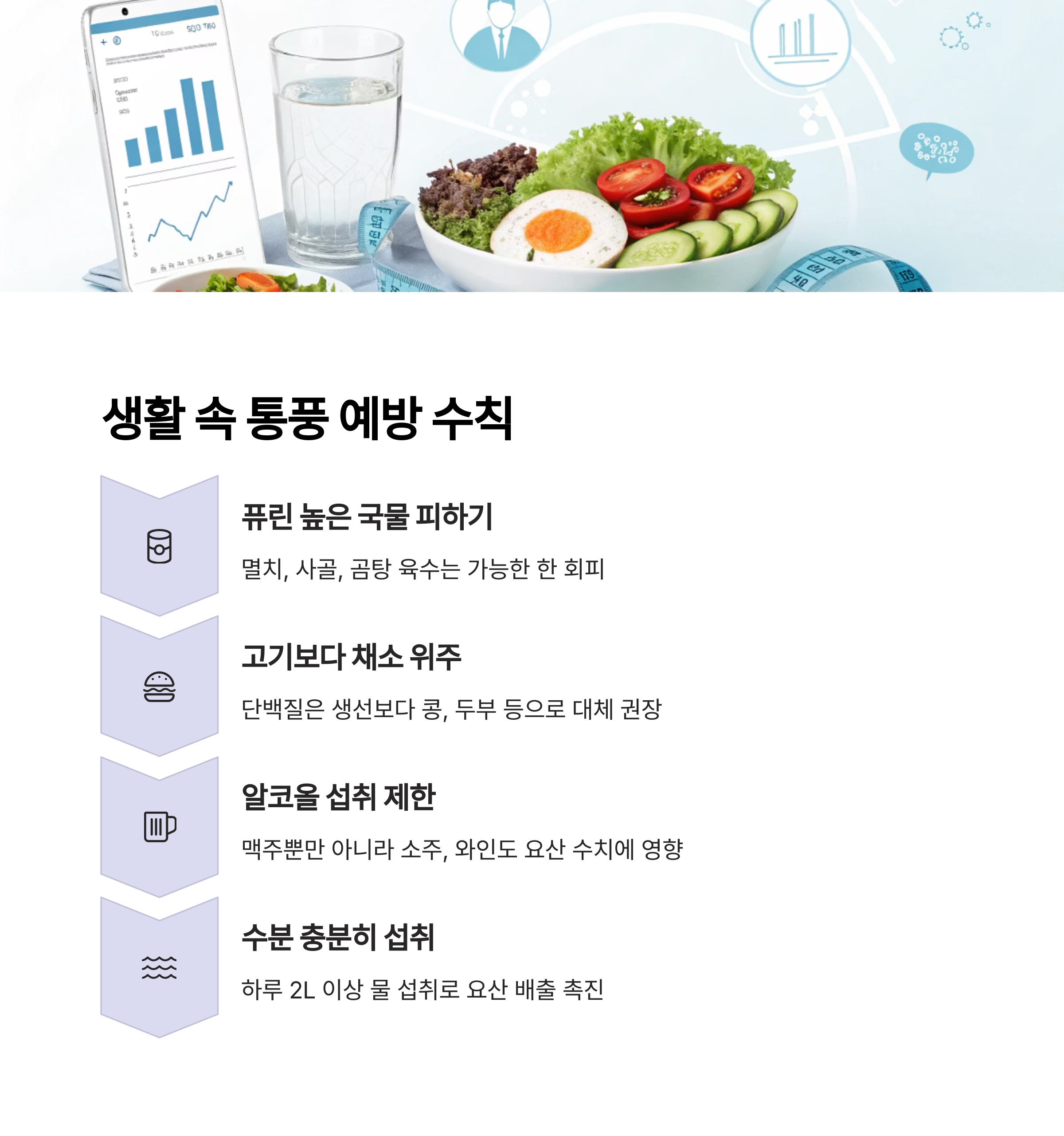 | 퓨린 높은 국물 피하기 | 멸치, 사골, 곰탕 육수는 가능한 한 회피 |