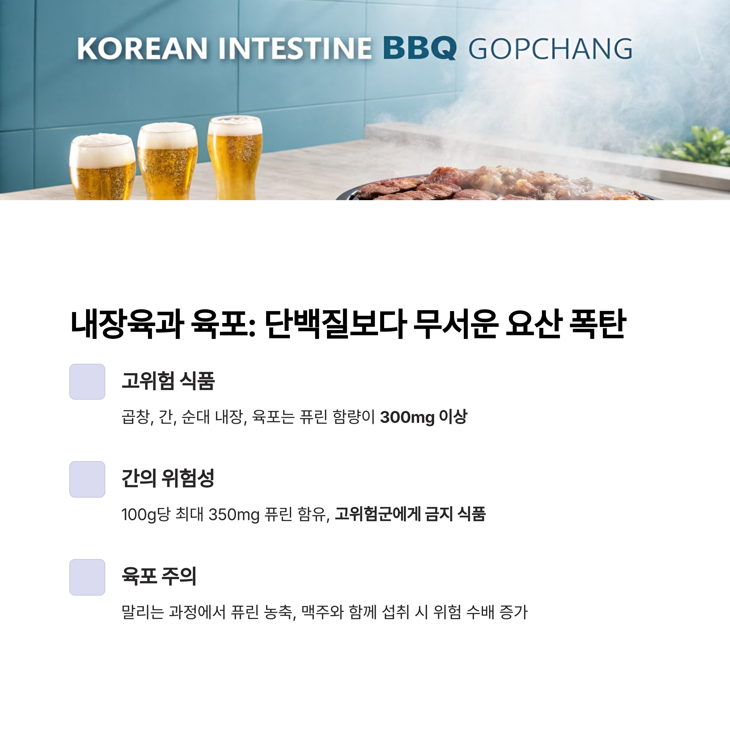 “간과 곱창은 단백질 섭취보다 요산 관리가 중요한 이들에게 치명적입니다”