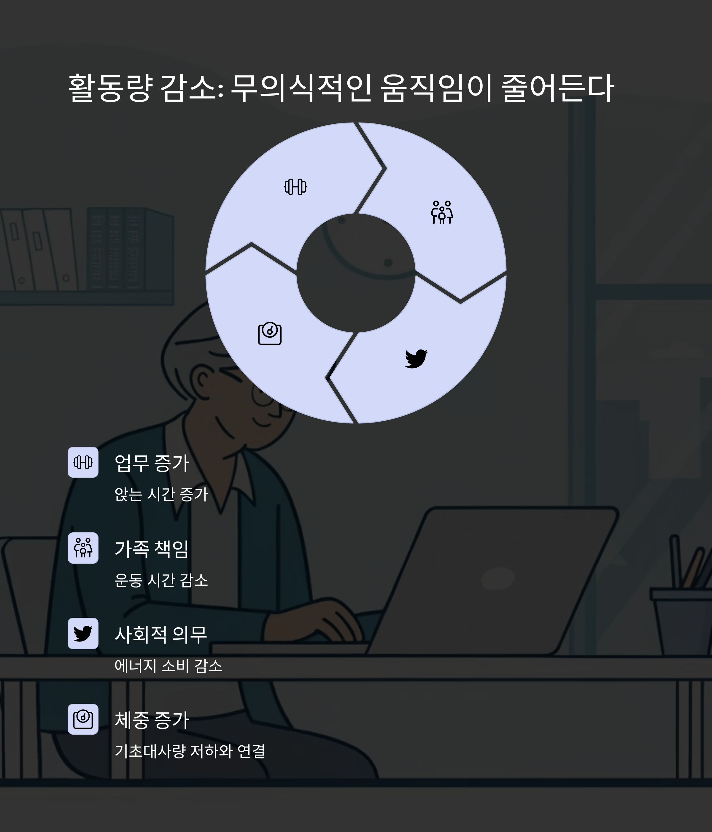 이러한 무의식적인 활동량 감소는 기초대사량 저하와 맞물려 체중 증가로 이어집니다