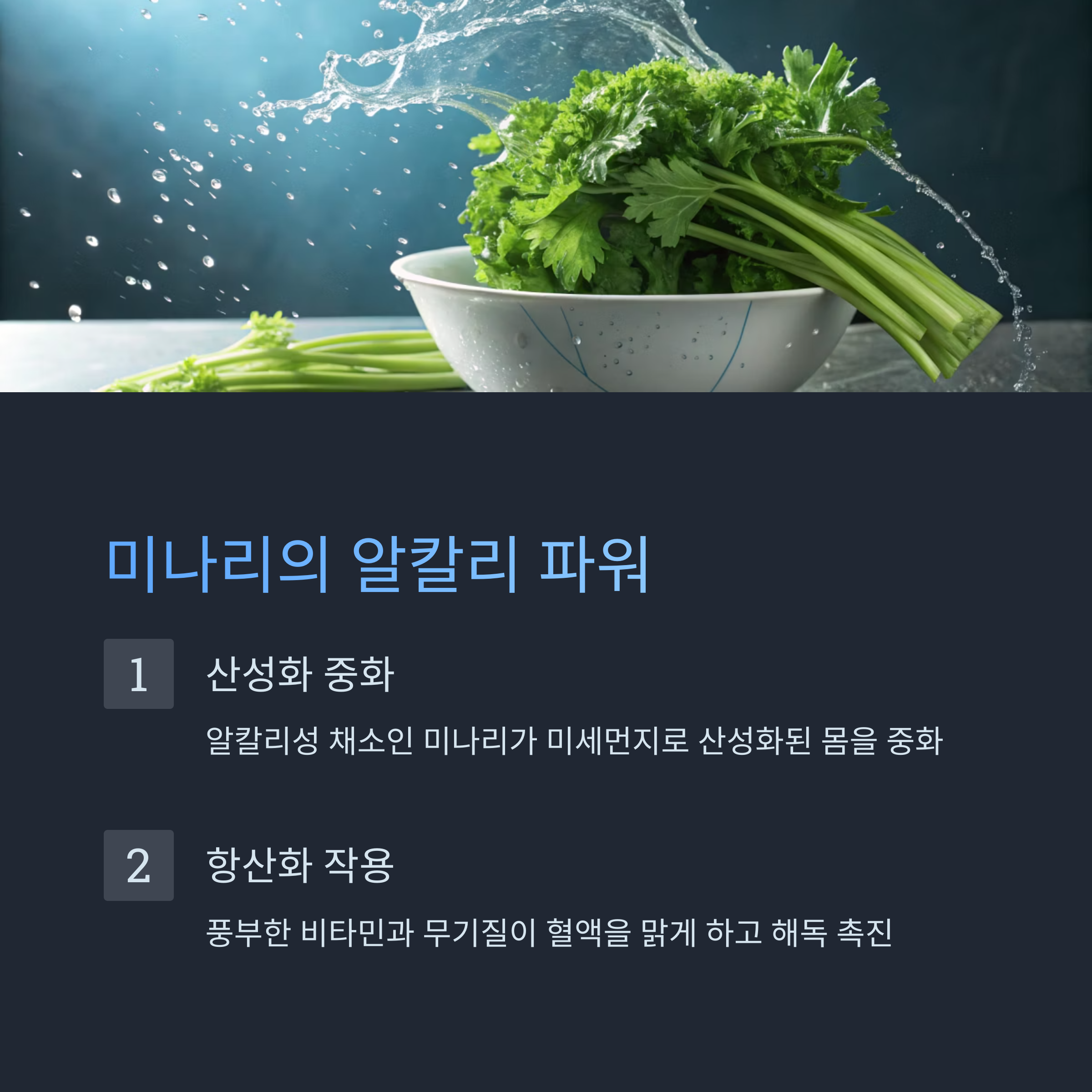 2️⃣ 미나리 – 산성화된 몸을 중화하는 알칼리성 채소