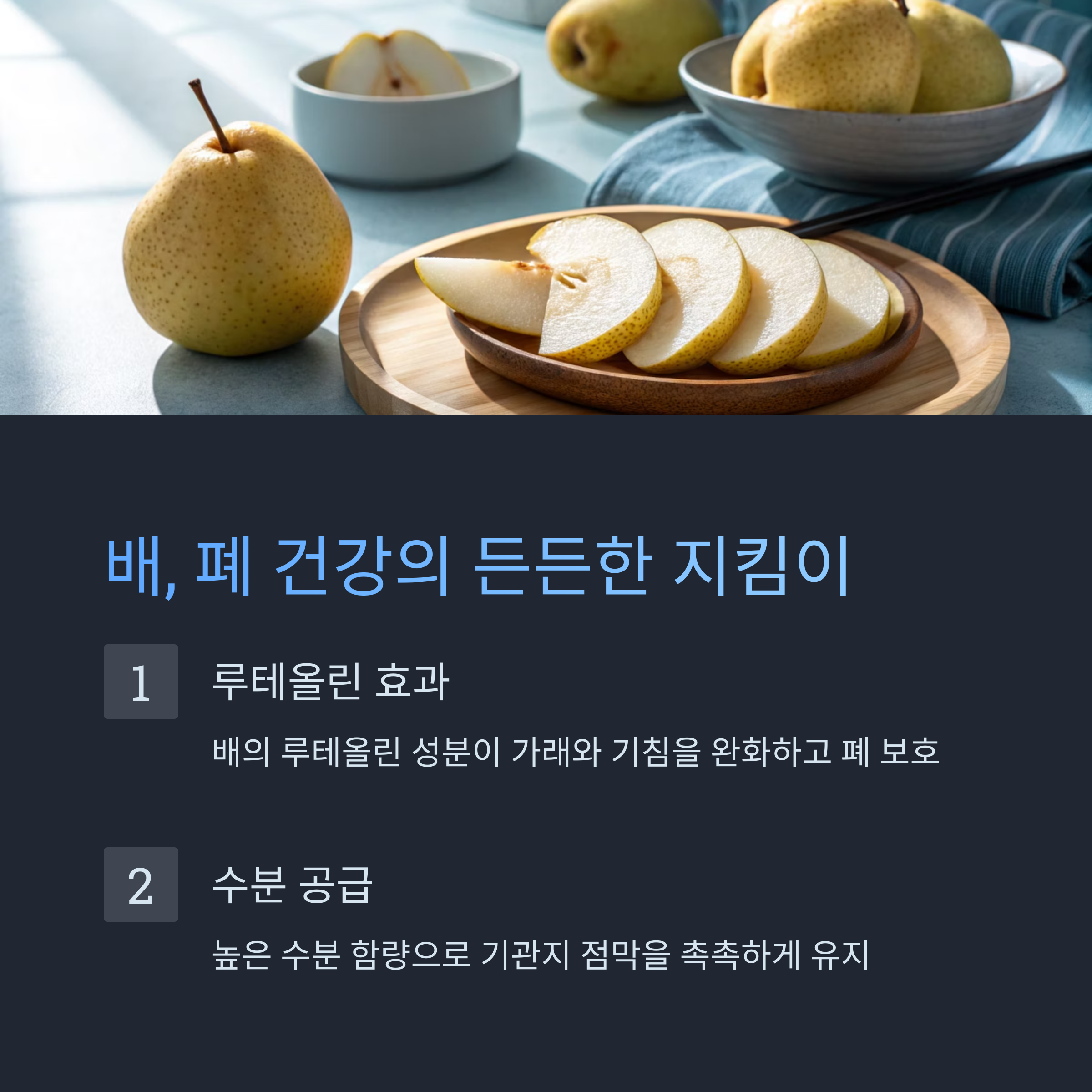 배에는 루테올린 성분이 들어 있어 가래와 기침을 완화하고, 항산화 효과로 폐를 보호하는 데 도움을 줍니다. 또한 높은 수분 함량은 기관지 점막을 촉촉하게 유지해 호흡기 건강에 유익합니다.