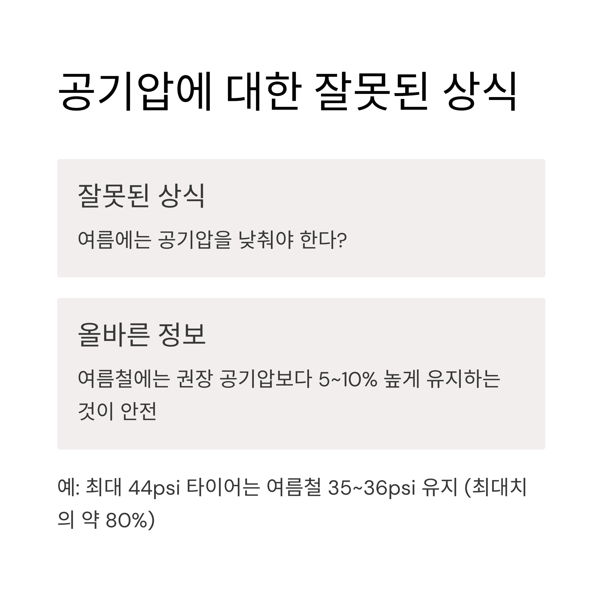 - 공기압 산정 공식: 최대 공기압 × 0.8 = 여름철 적정 공기압
