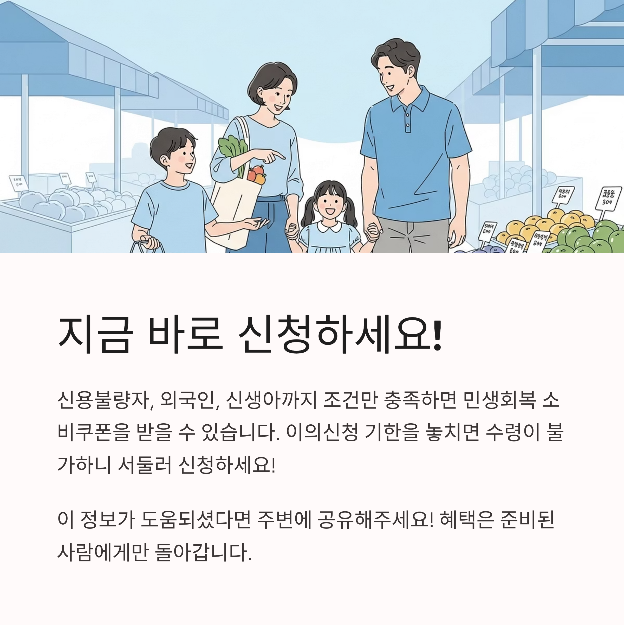 신용불량자이든 외국인이든, 혹은 이제 막 태어난 신생아라도 조건만 충족하면 민생회복 소비쿠폰을 신청할 수 있다. 정부는 형평성과 복지를 강화하기 위해 다양한 예외 적용을 열어뒀으니, 본인이나 가족이 해당된다면 반드시 신청해 혜택을 누리자.